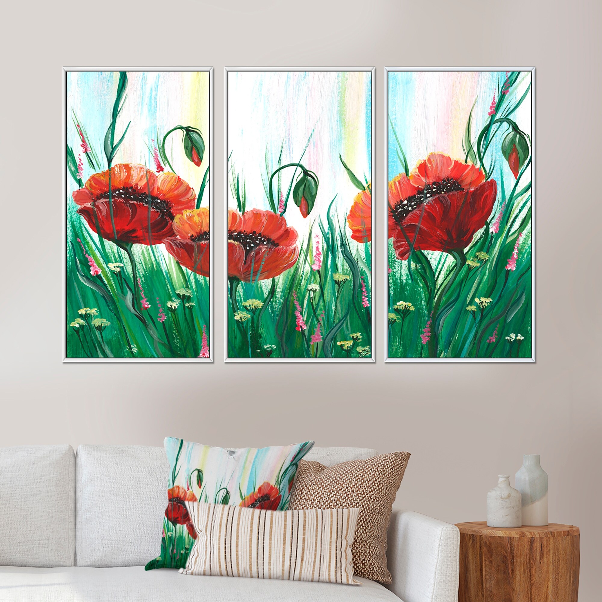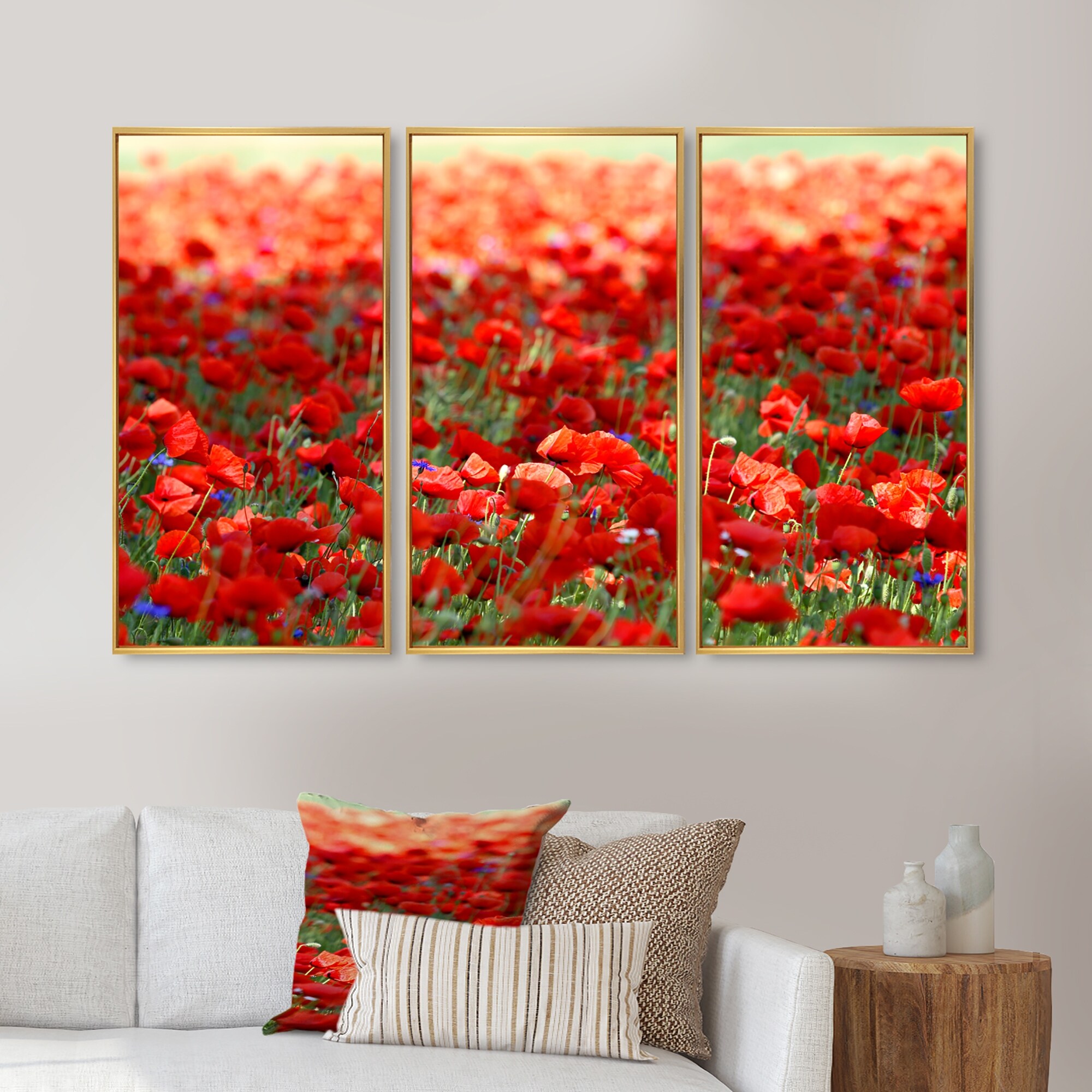 Designart "Thick Red Poppy Flower Field" Floral Framed Artwork Set of 3 - 4 Colors of Frames