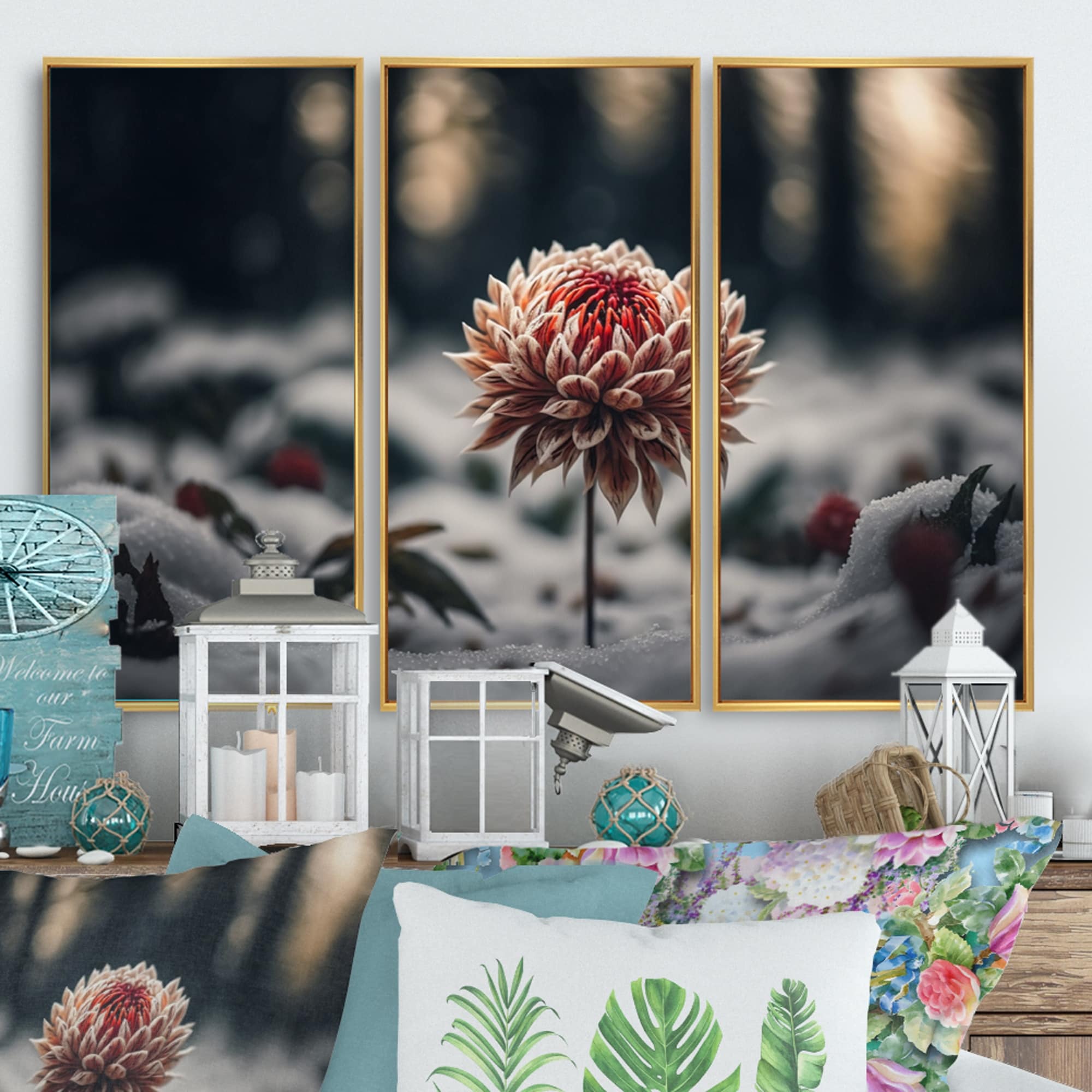 Designart "A Blooming Red Dahlia Flower in Winter III" Floral Daisy Framed Canvas Art Print - 3 Panels