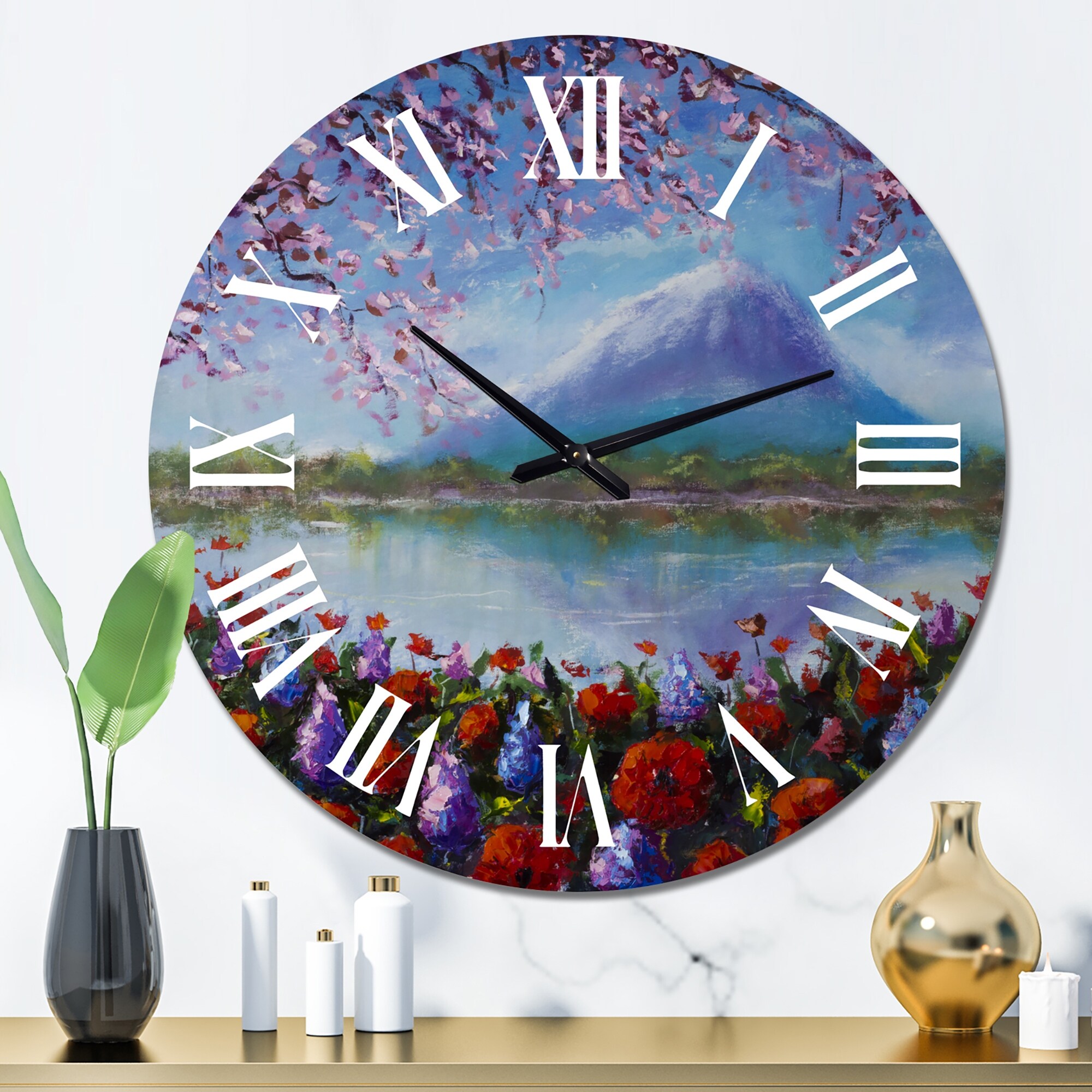 Designart 'Sakura and Red Flowers By Lake With Mountain' Traditional wall clock