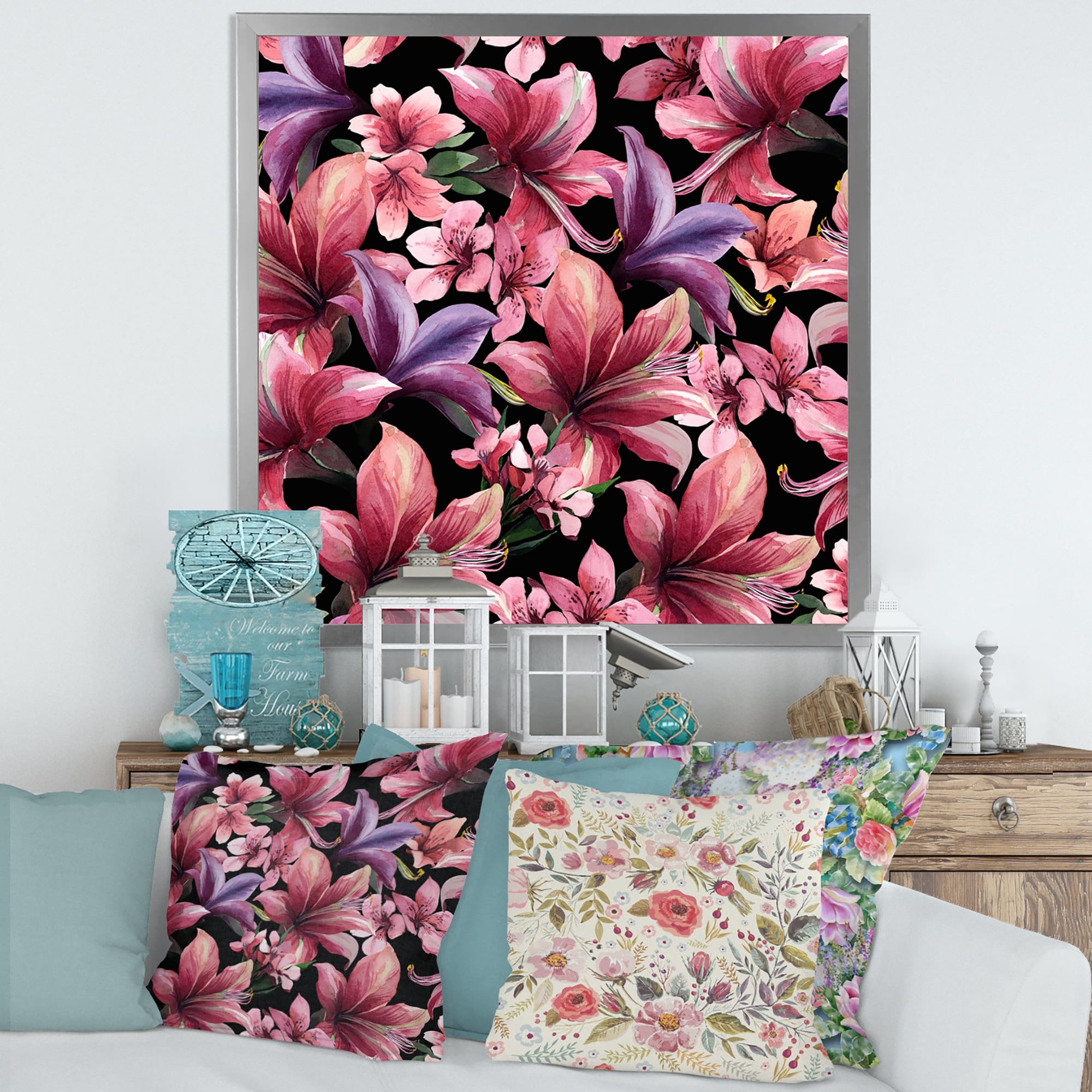 Designart "Tropical Red Flowers on Black I" Traditional Framed Art Print