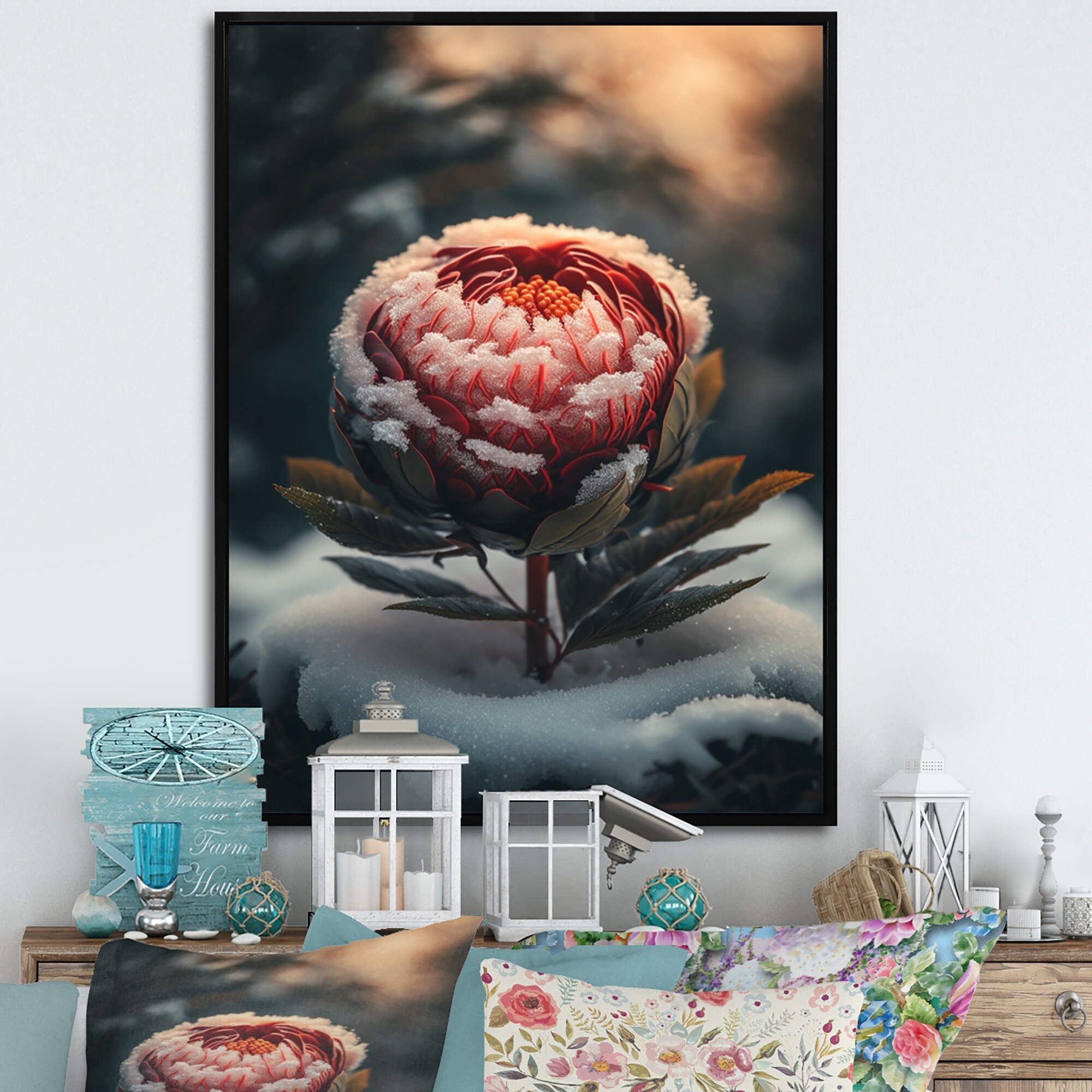 Designart "A Blooming Red Peony Flower in Winter I" Floral & Botanical Framed Canvas Art Print
