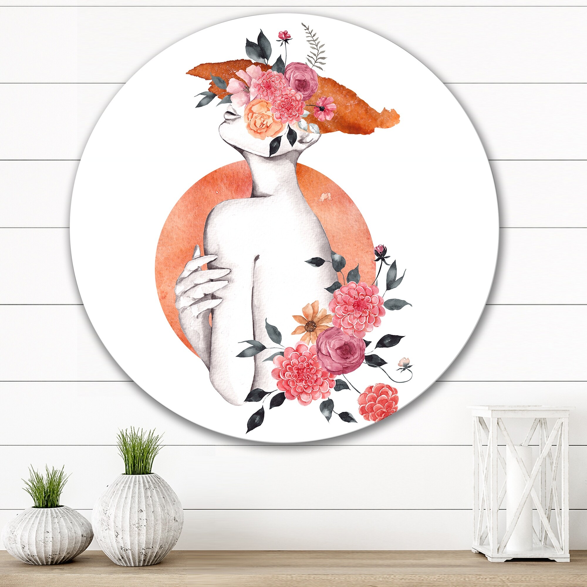 Designart 'Woman Silhouette With Red And Purple Flowers I' Glam Metal Circle Wall Art