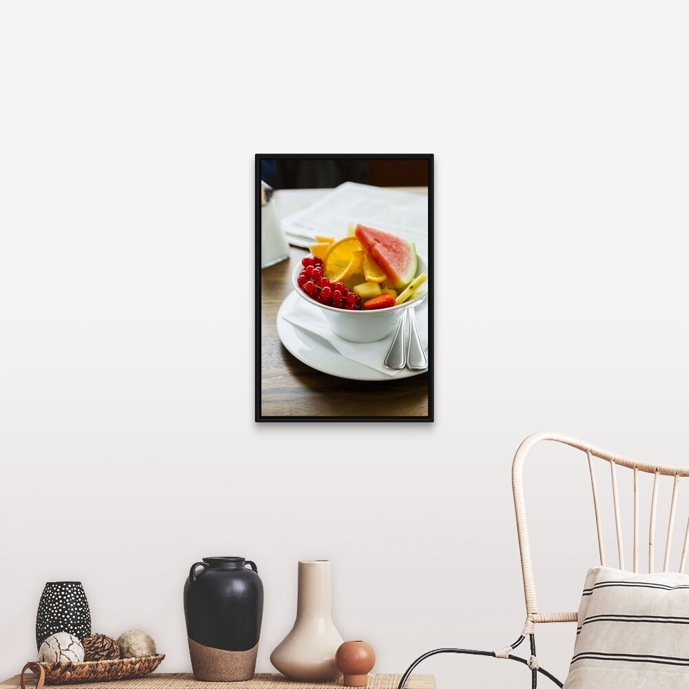 "Bowl of fruit on table" Black Float Frame Canvas Art