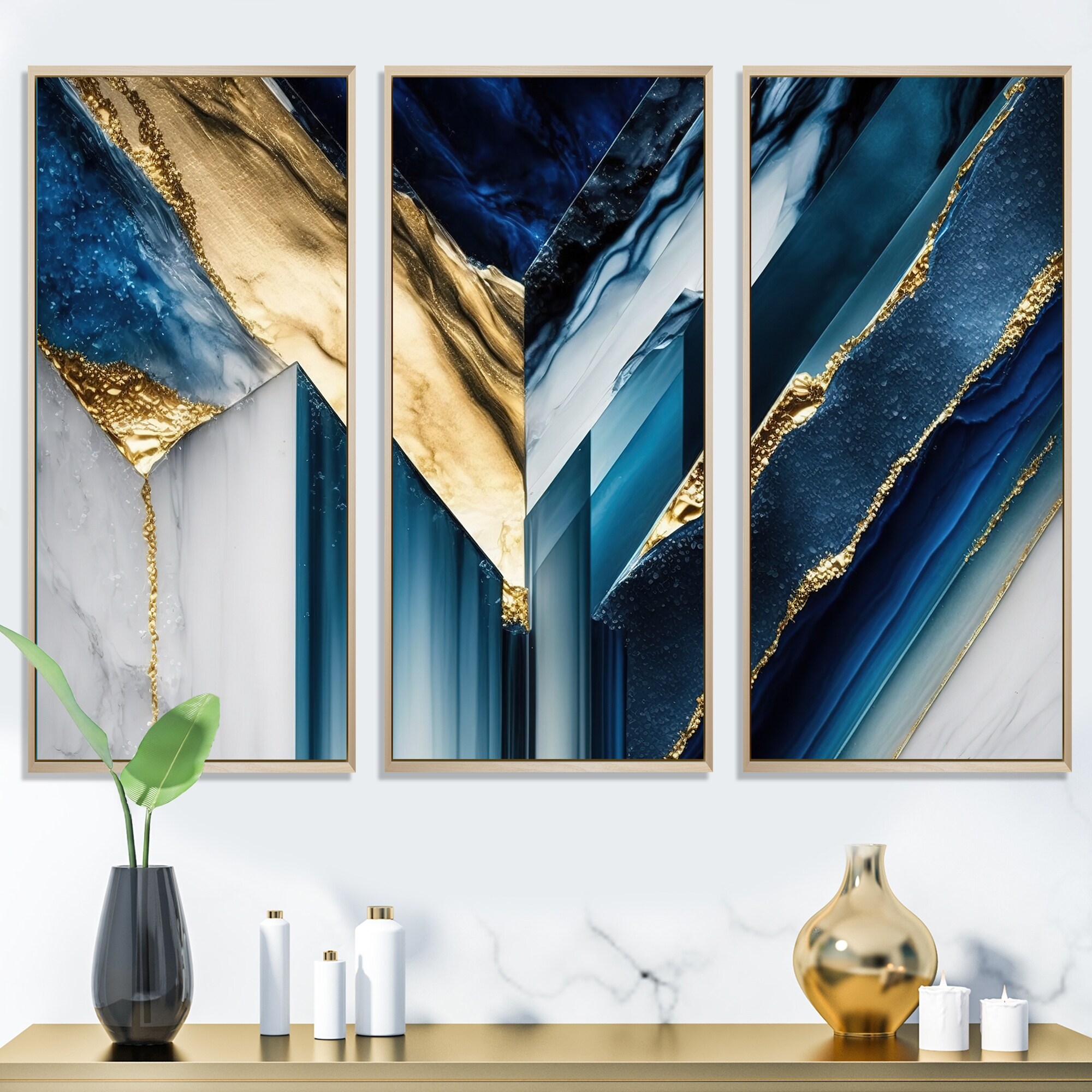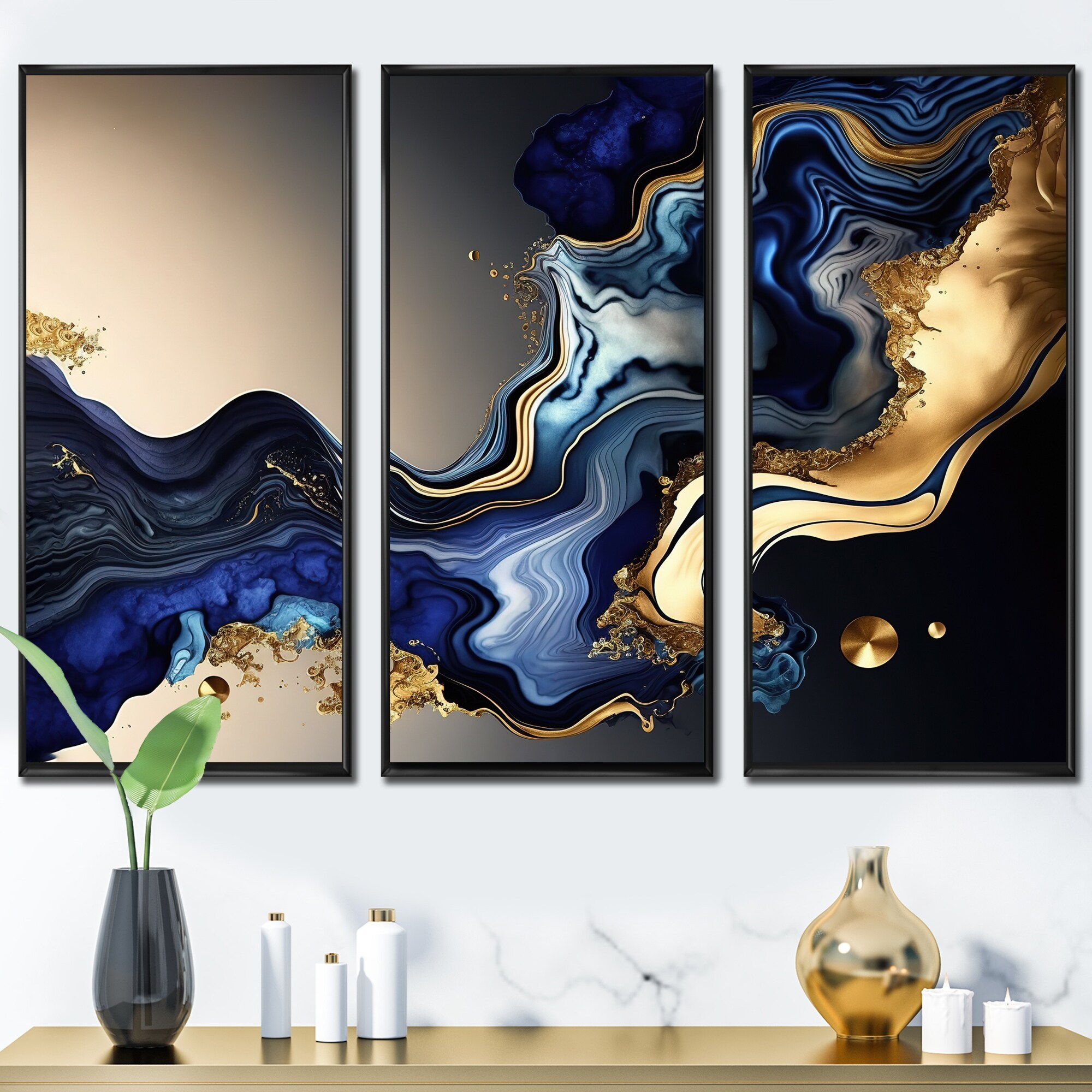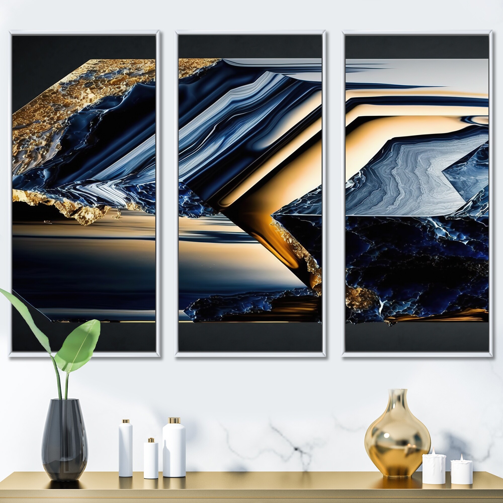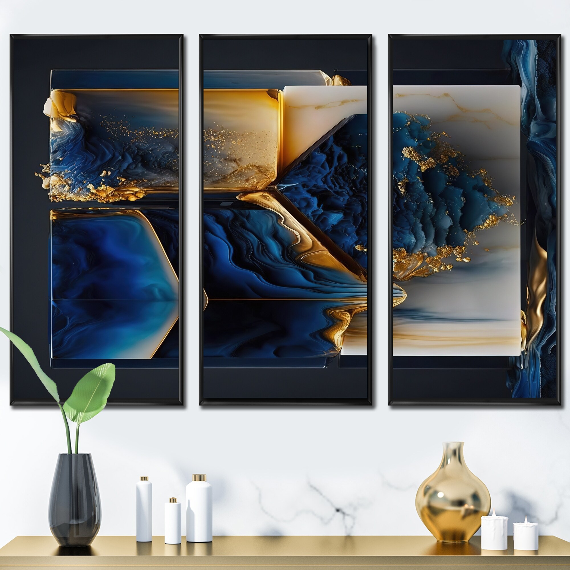 Designart "Abstract Geode Gold And Blue Marble Shape II" Modern Geometric Framed Canvas Art Print - 3 Panels