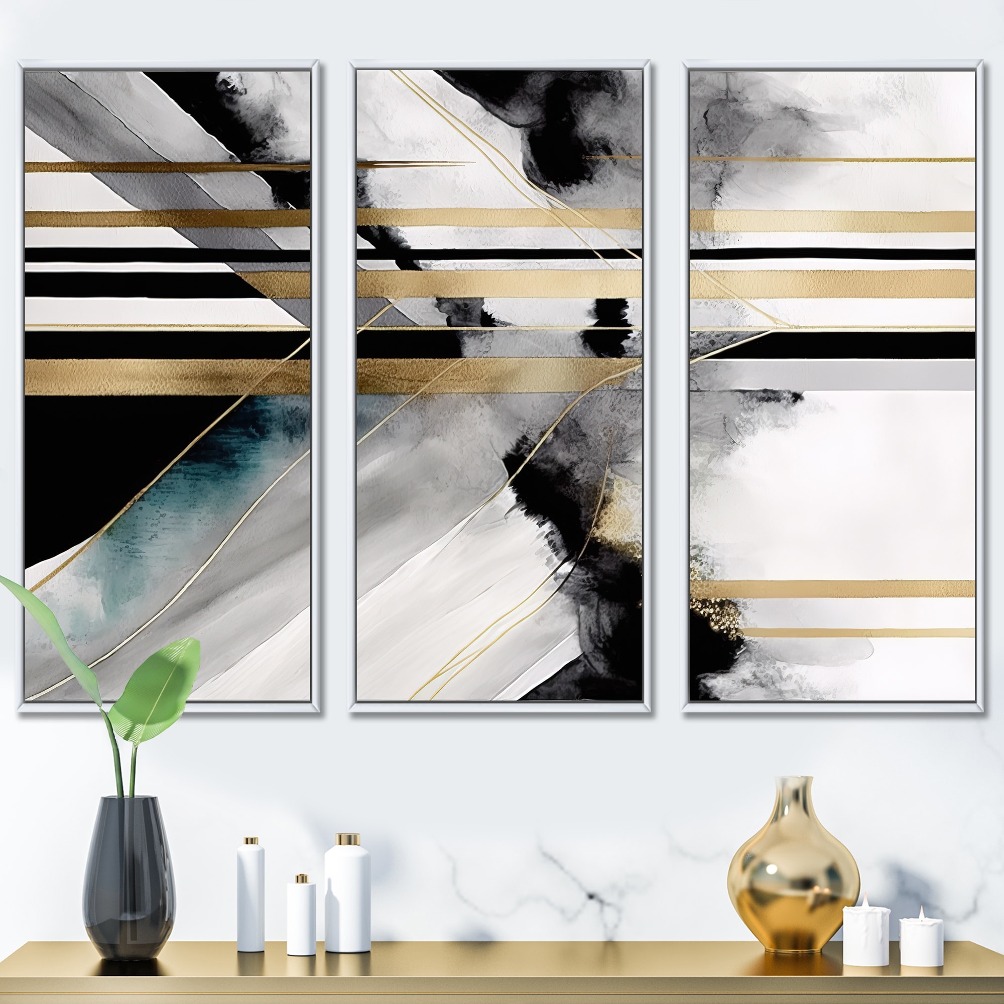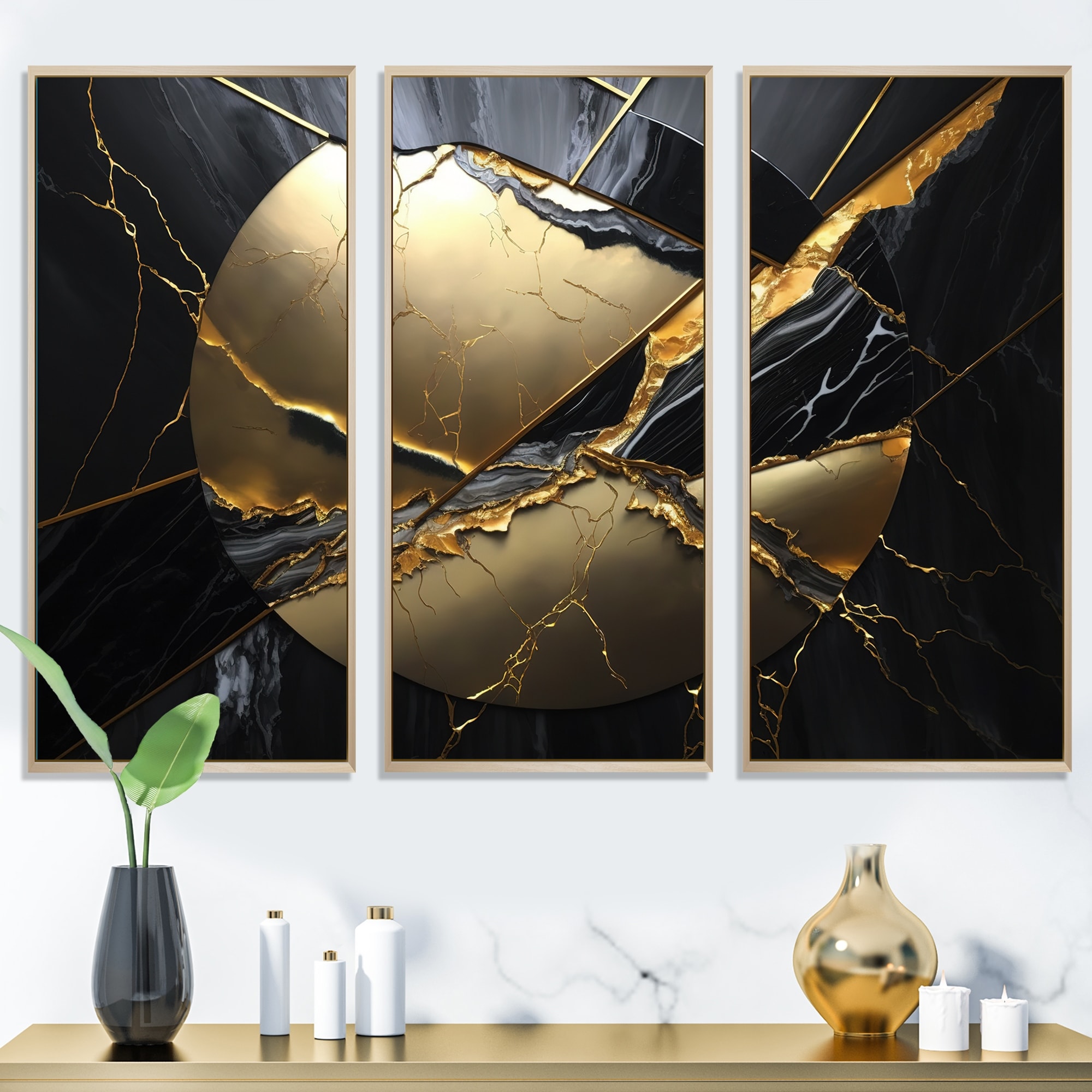 Designart "Abstract Geode Geometric Black And Gold I" Modern Geometric Framed Canvas Art Print - 3 Panels
