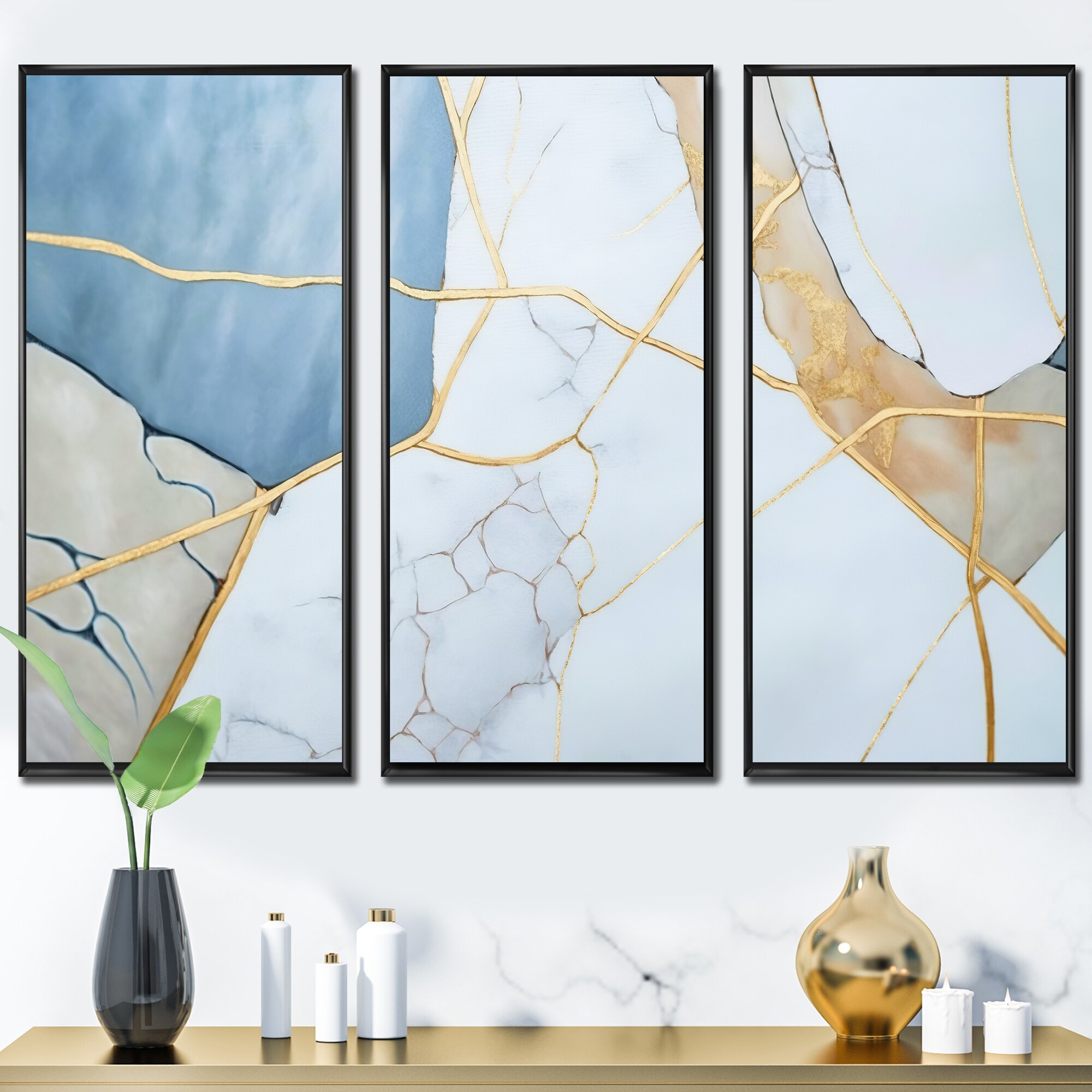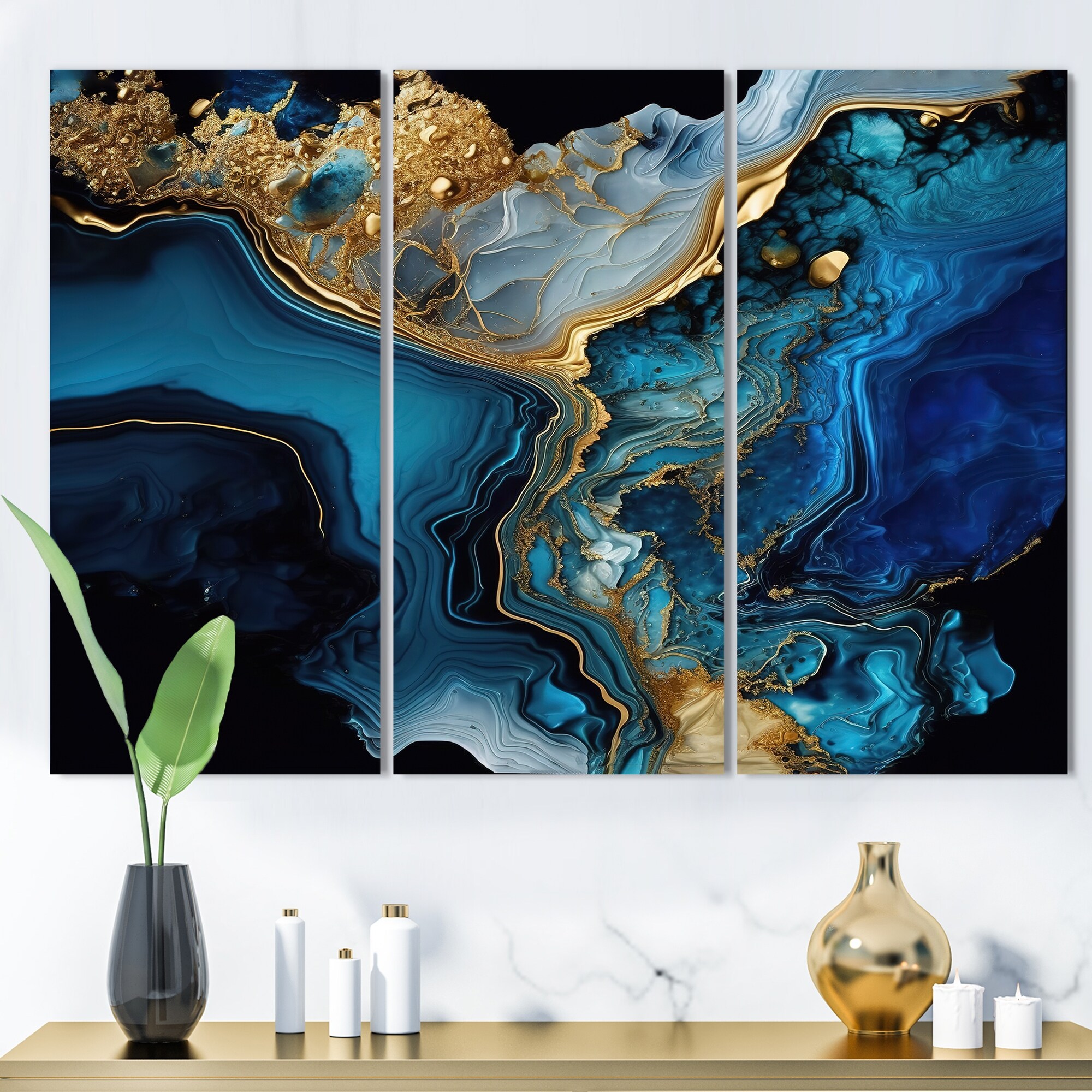 Designart "Abstract Geode Gold And Blue Marble IV" Abstract Marble Canvas Art Print - 3 Panels