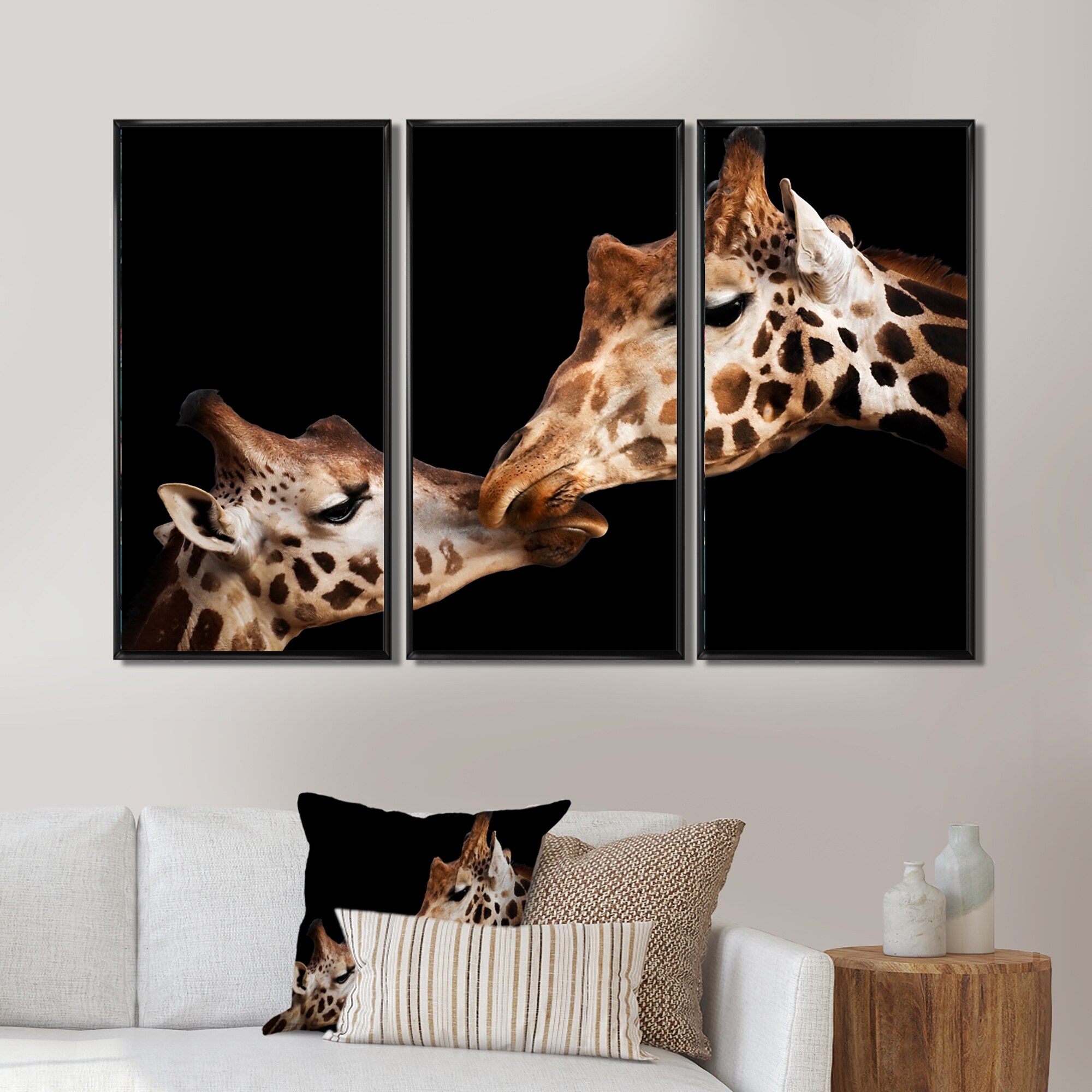 Designart "Portrait Of Two Giraffes Kissing II" Farmhouse Framed Art Set of 3 - 4 Colors of Frames
