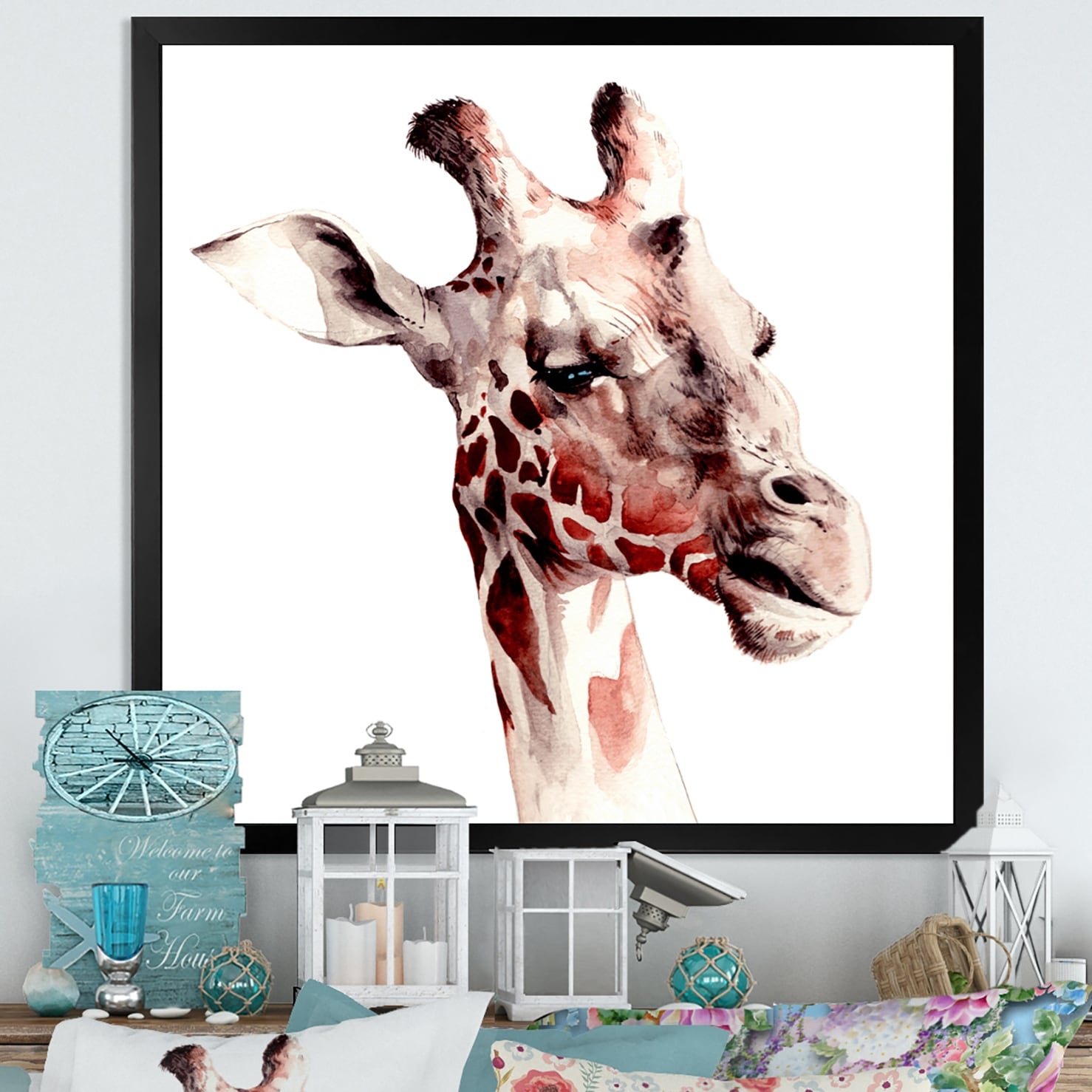 Designart "Portrait of a Giraffe With Flowers III" Farmhouse Framed Canvas Wall Art Print
