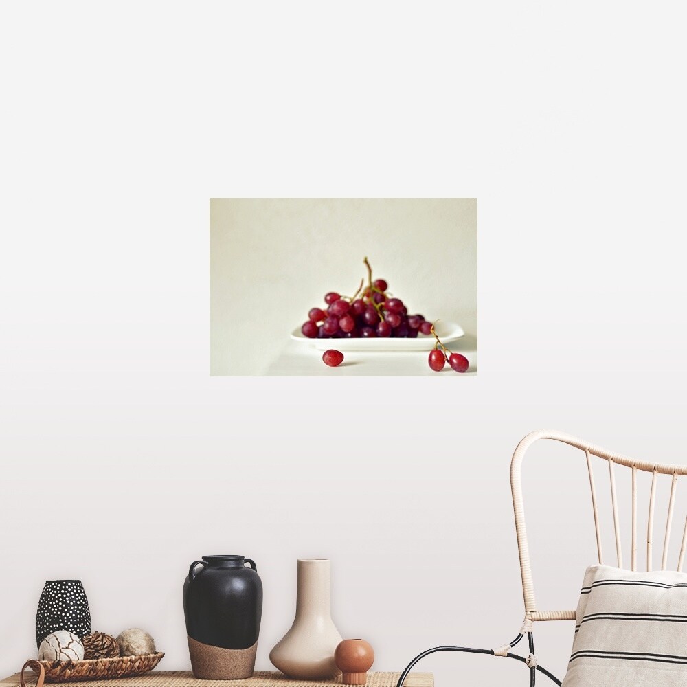 "Red grapes on white square plate on white table against white wall." Poster Print - Multi