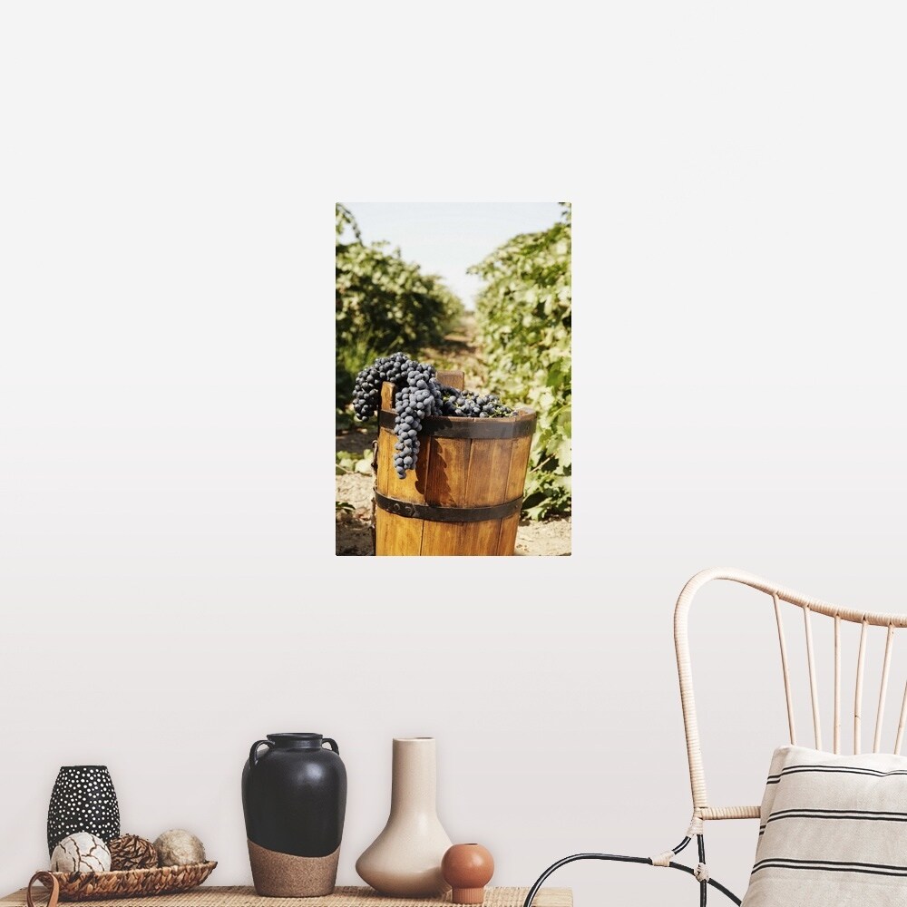 "Red grapes in antique basket in vineyard" Poster Print - Multi