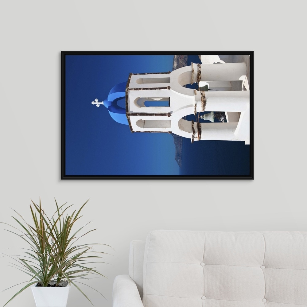 "Greece, Cyclades Islands, Santorini, Oia, Church bell tower at coast" Black Float Frame Canvas Art