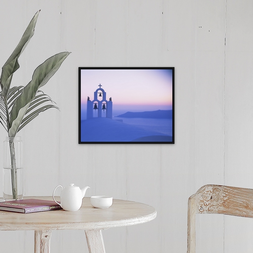 "Bell tower of a church at sunset, Santorini, Greece" Black Float Frame Canvas Art