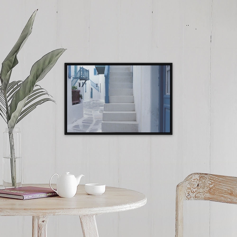 "Stairs on side of building, Mikonos, Greece" Black Float Frame Canvas Art
