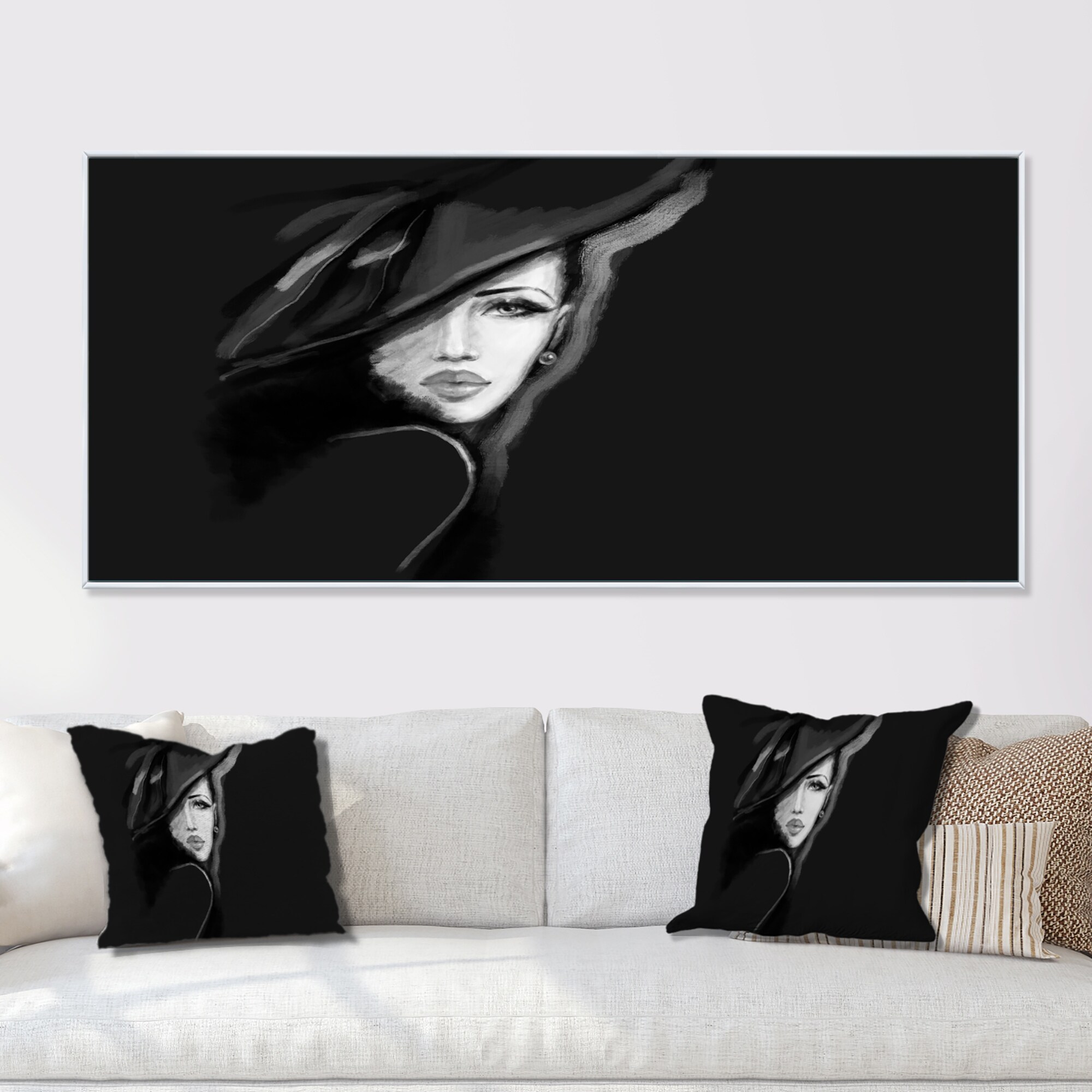 Designart "Stylish Monochrome Fashionista With Black Hat" Fashion Framed Canvas artwork