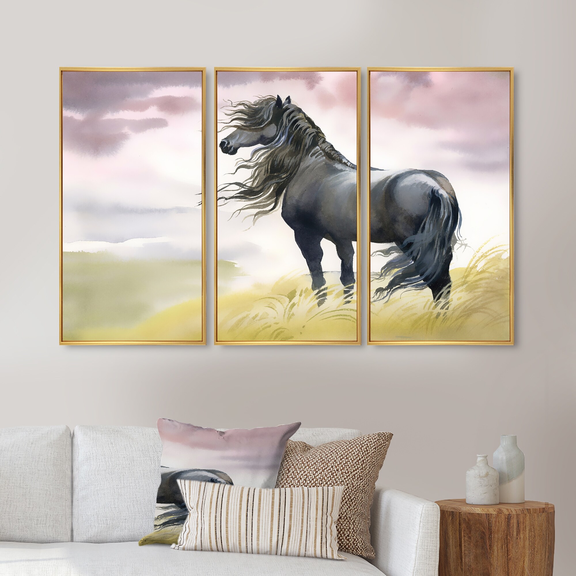 Designart "Black Horse in A Field" Traditional Framed Wall Art Set of 3 - 4 Colors of Frames