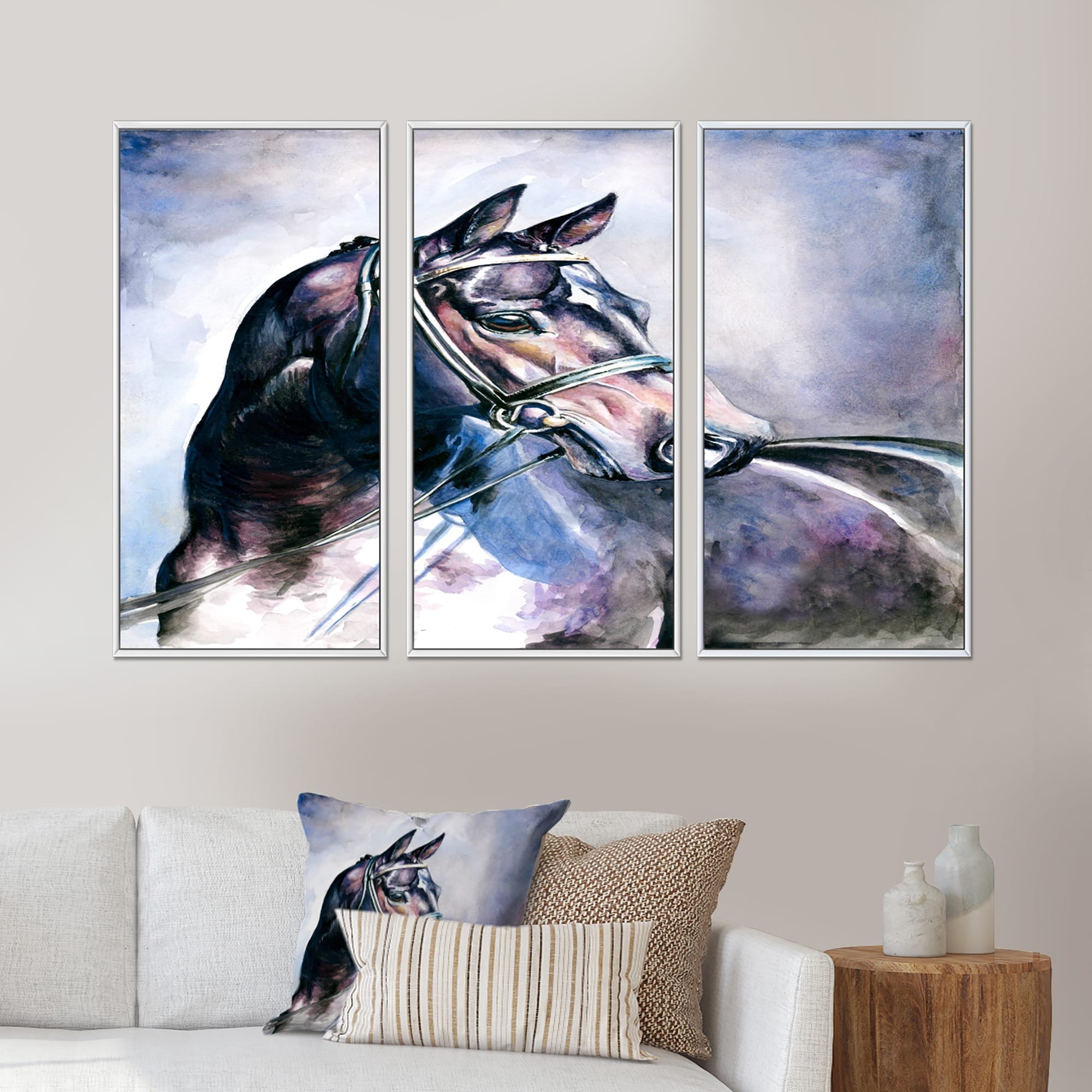 Designart "Black Horse with Bridle" Animal Framed Wall Art Set of 3 - 4 Colors of Frames
