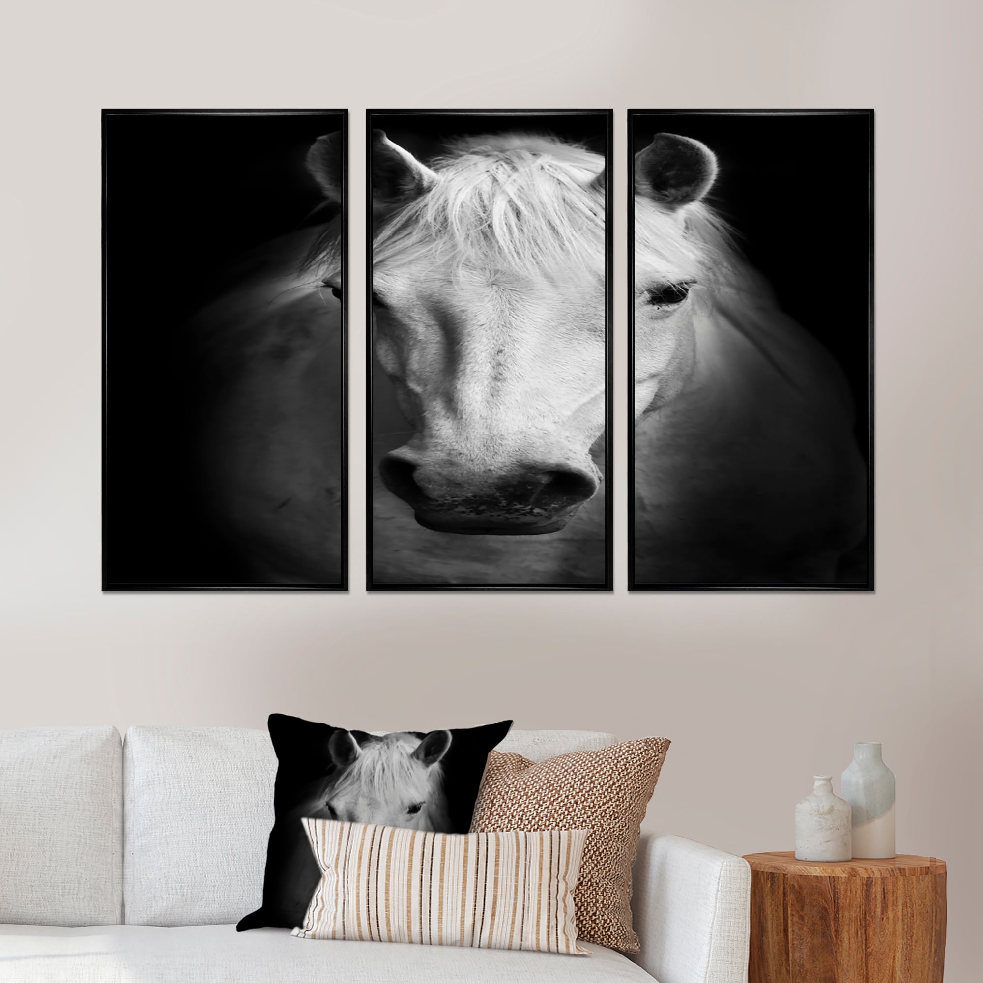 Designart "White Horse Black and White" Animal Framed Wall Decor Set of 3 - 4 Colors of Frames