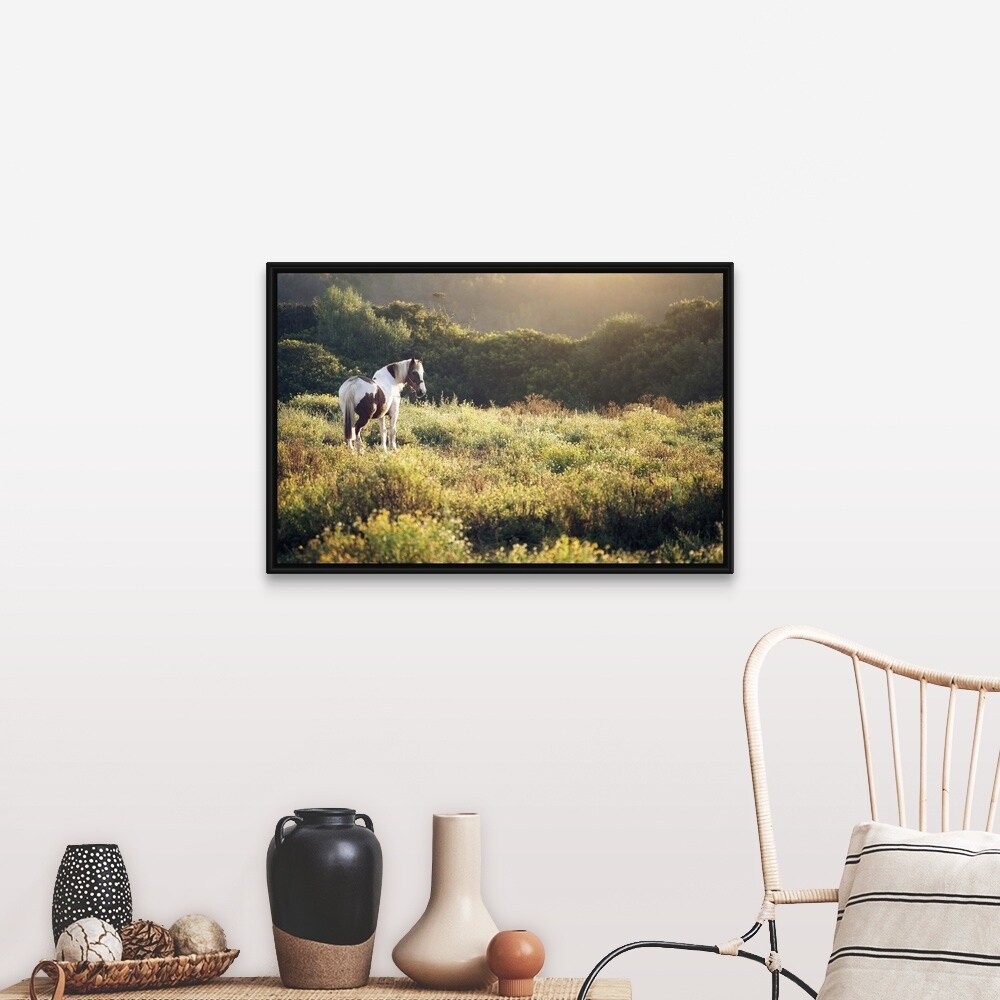 "Horse on meadow at sunrise." Black Float Frame Canvas Art