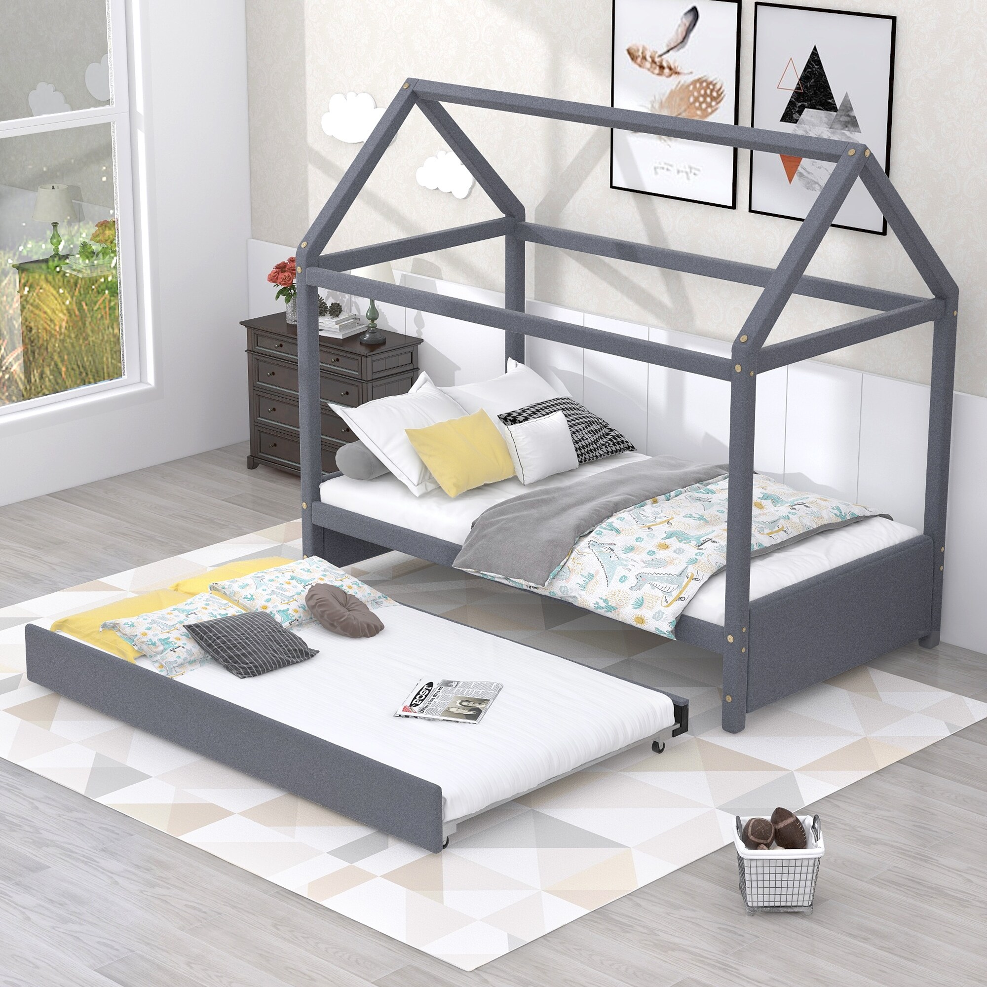 Twin Size Gray Upholstered House Platform Bed with Trundle and Open Frame Roof