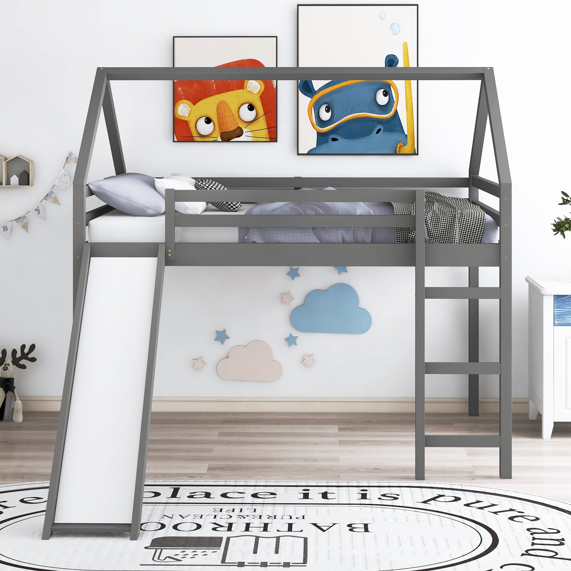 House Loft Bed w/Slide, Twin Size Loft Beds w/Slide, Ladder & Roof