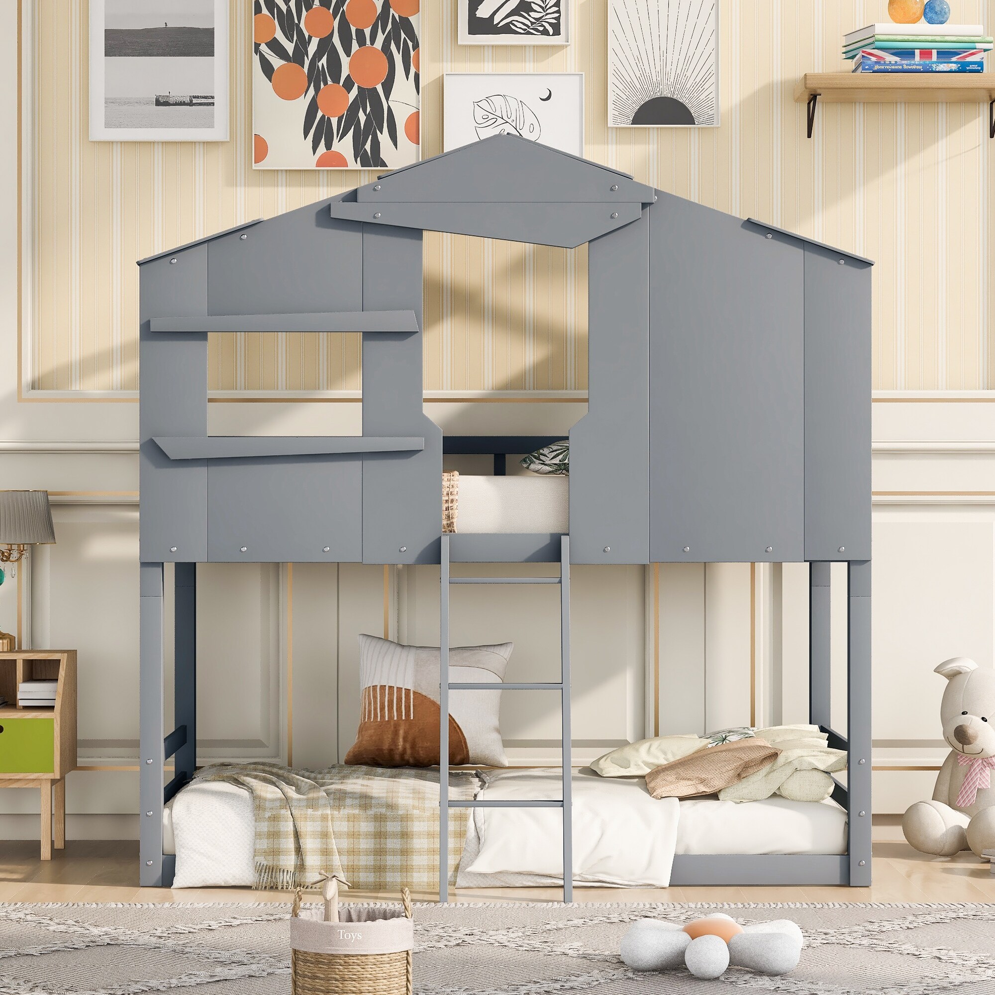 House Bunk Bed with Built-in Ladder,Twin over Twin