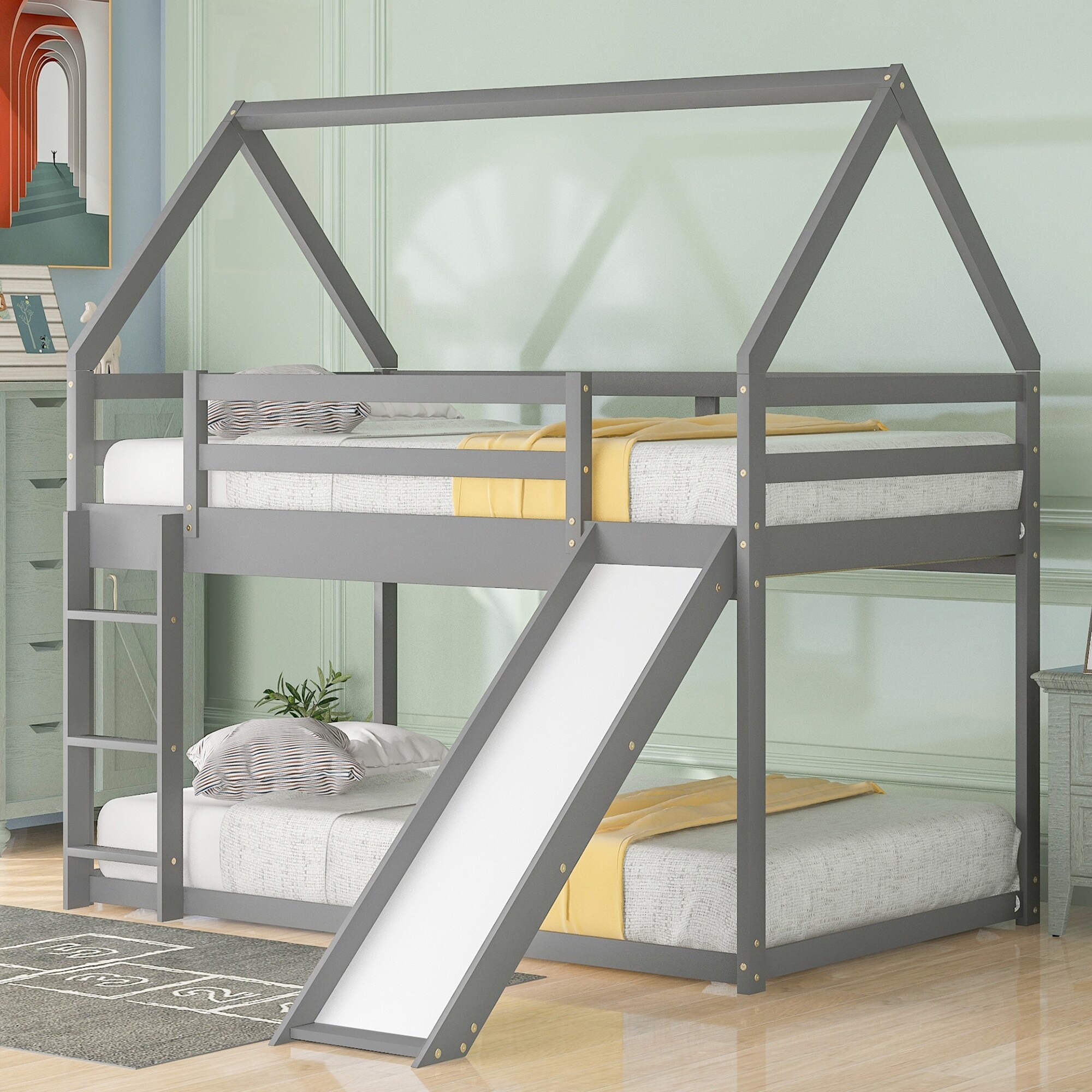 Wooden Twin Over Twin Bunk Bed, House Bed with Slide