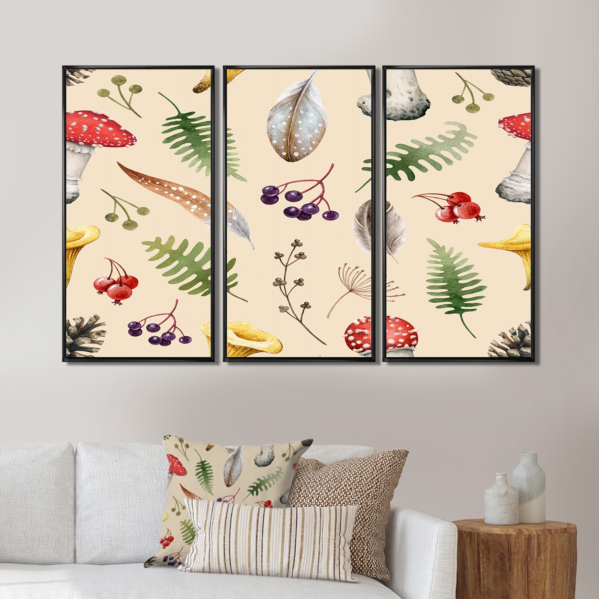 Designart "Wild Forest Herbs And Mushroom on Beige" Patterned Framed Art Prints Set of 3 - 4 Colors of Frames