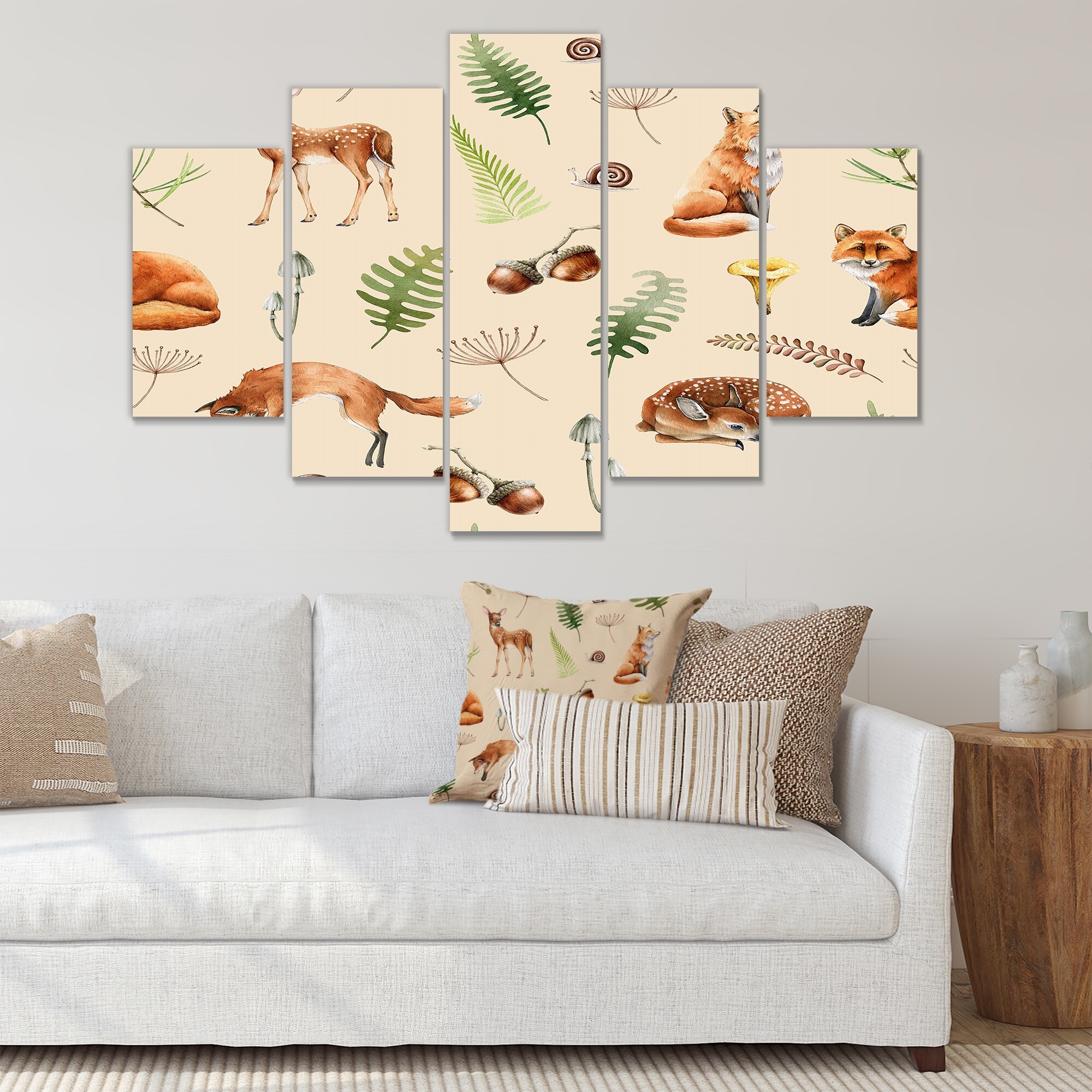 Designart "Fox And Deer With Herbs Fern And Mushrooms" Patterned Canvas Wall Art Print - 60x32 - 5 Panels