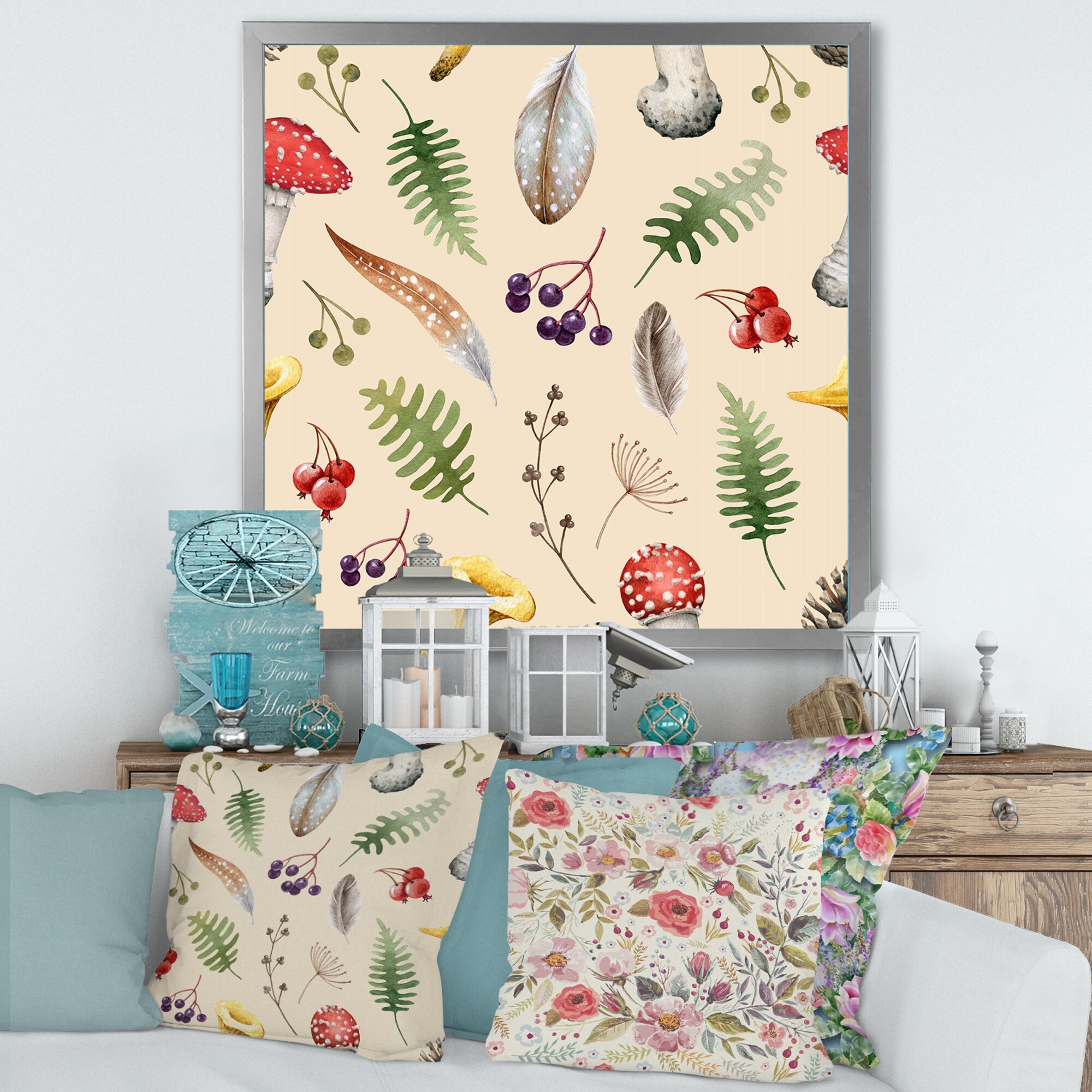 Designart "Wild Forest Herbs And Mushroom on Beige" Patterned Framed Art Print