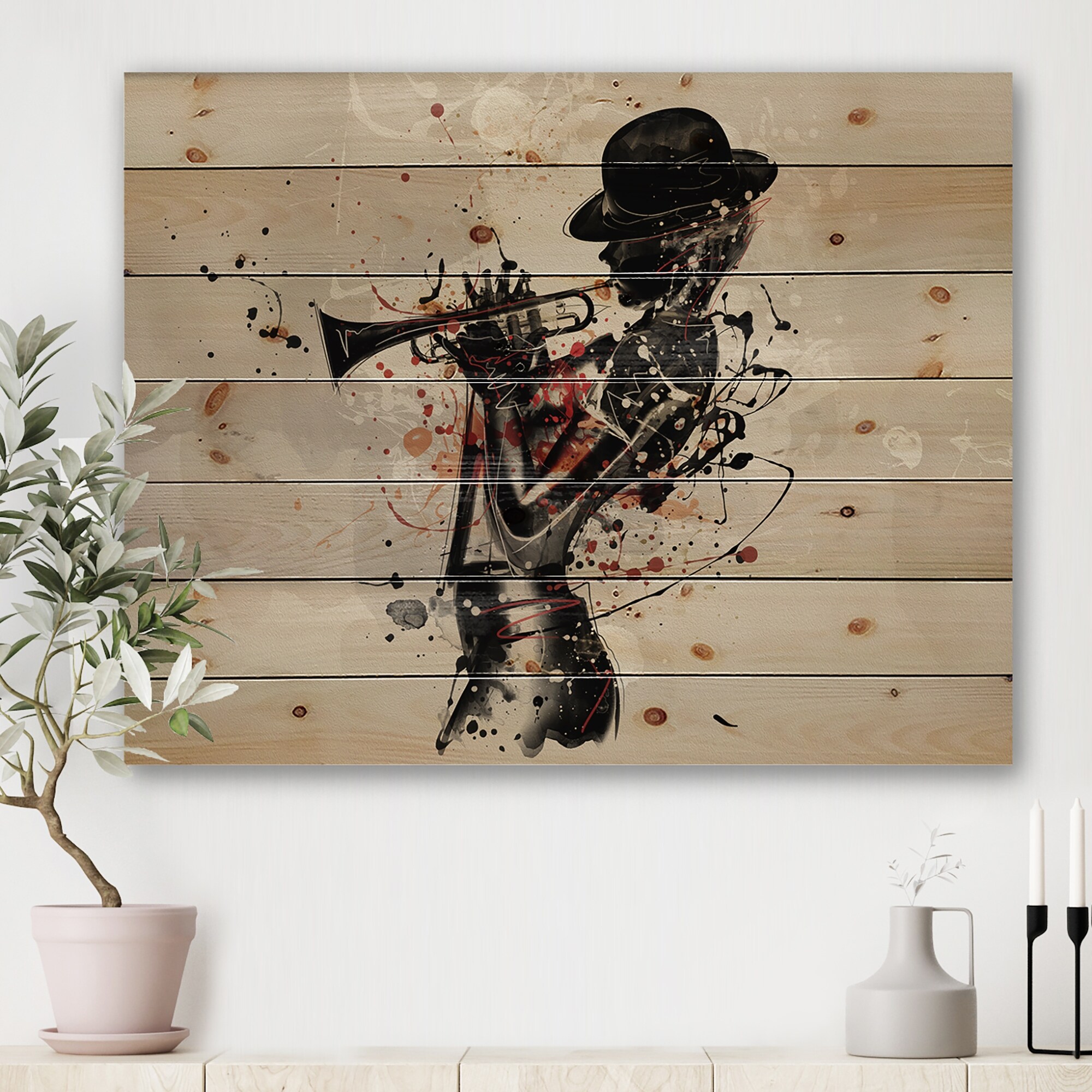 Designart 'Woman Playing Jazz Trumpet' Modern Print on Natural Pine Wood
