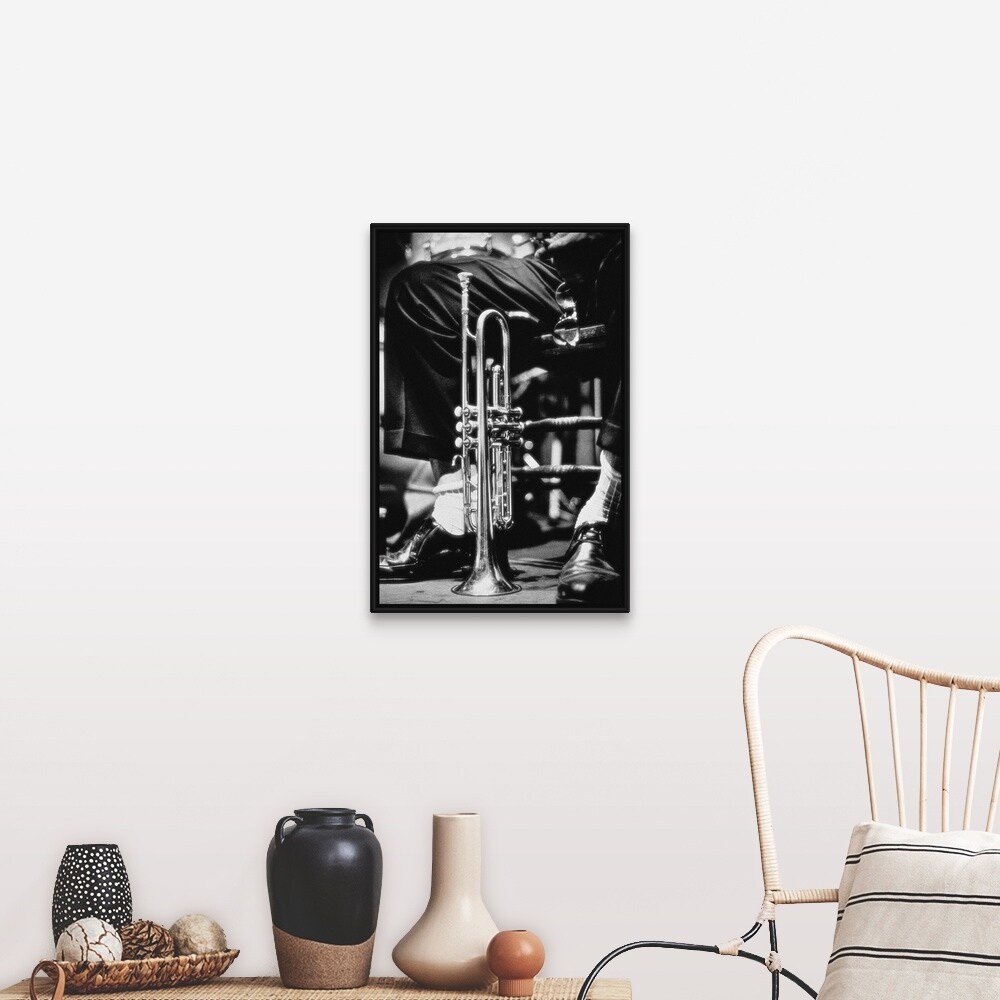 "Trumpet between jazz player's legs" Black Float Frame Canvas Art