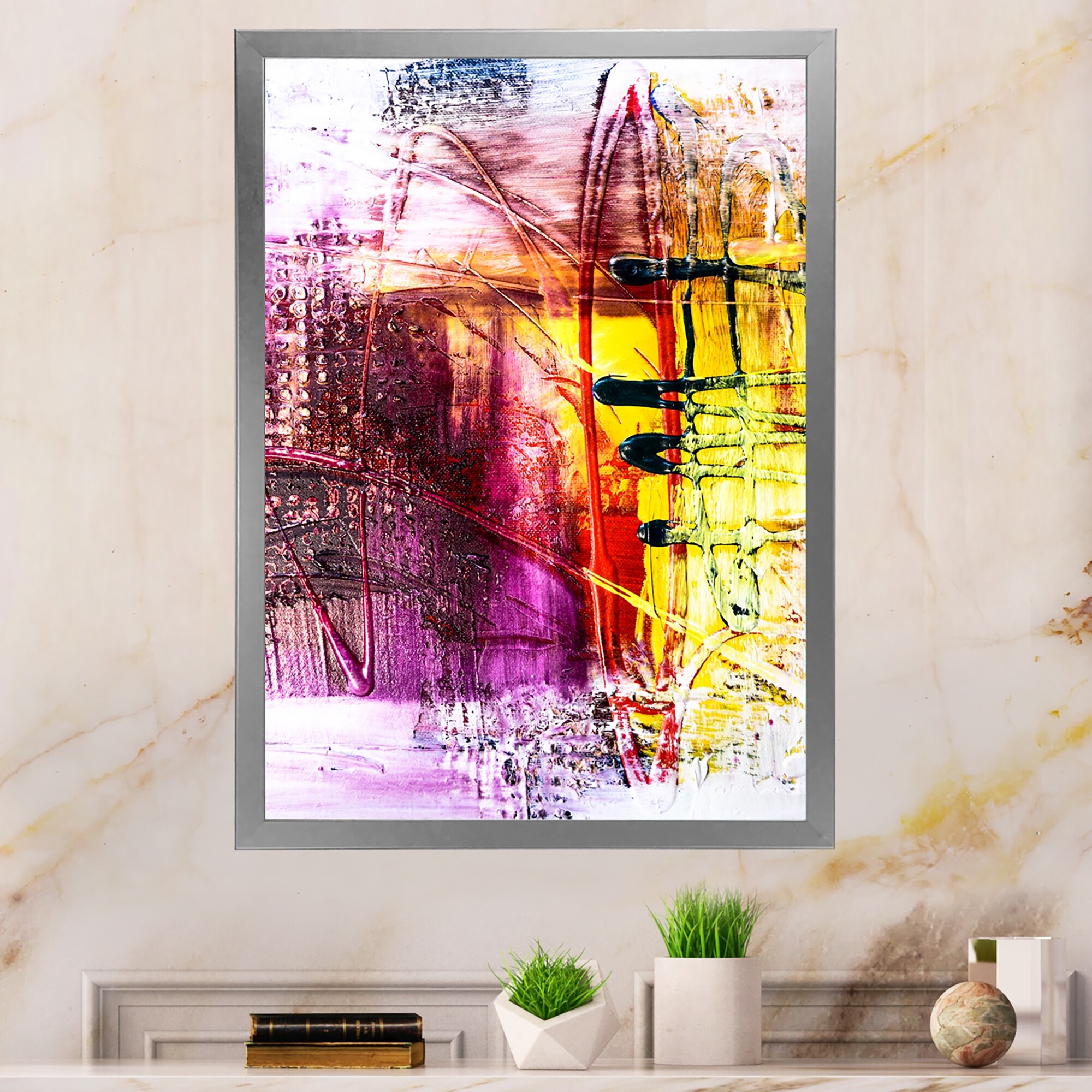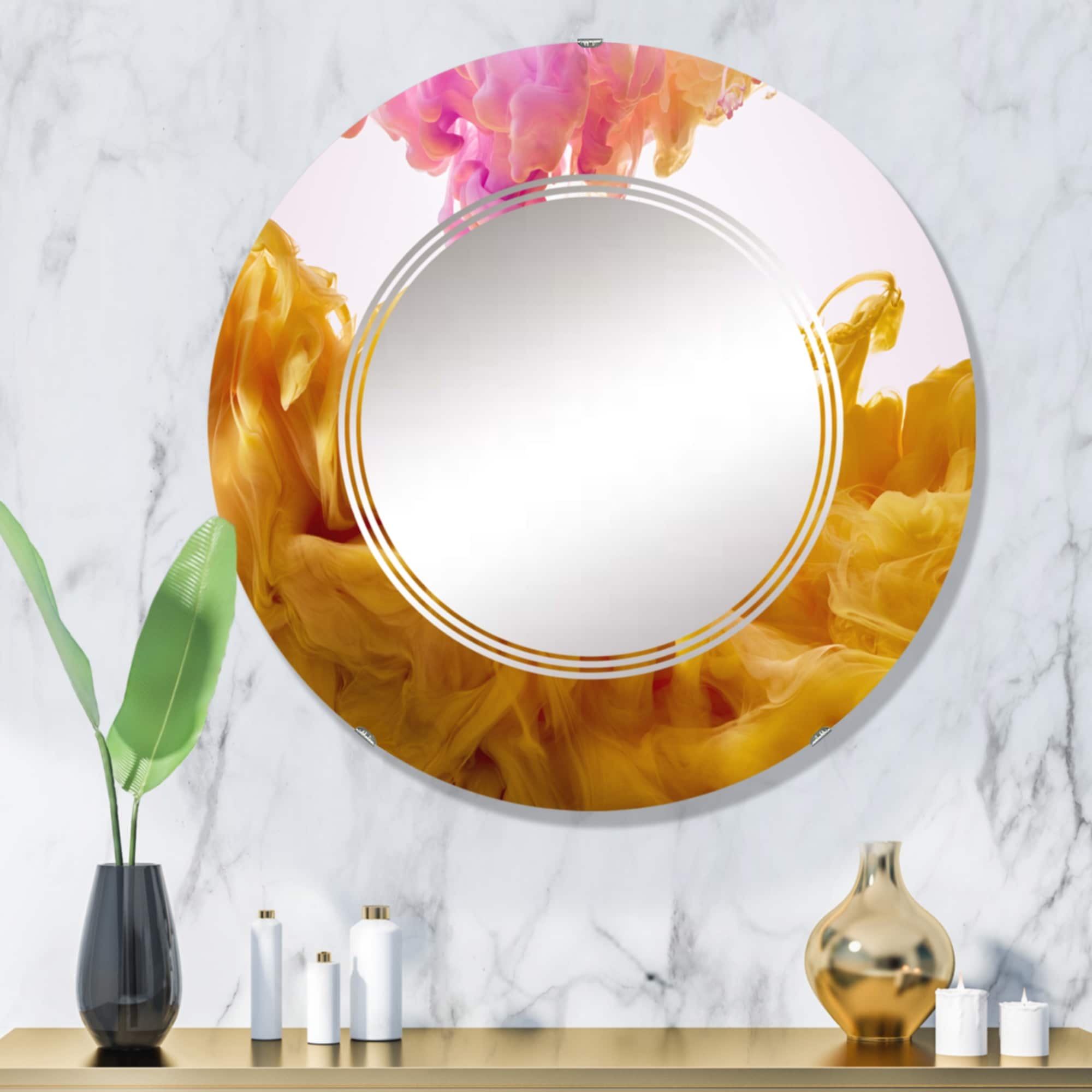 Designart 'Yellow And Pink Dancing Ink Clouds' Printed Modern Wall Mirror