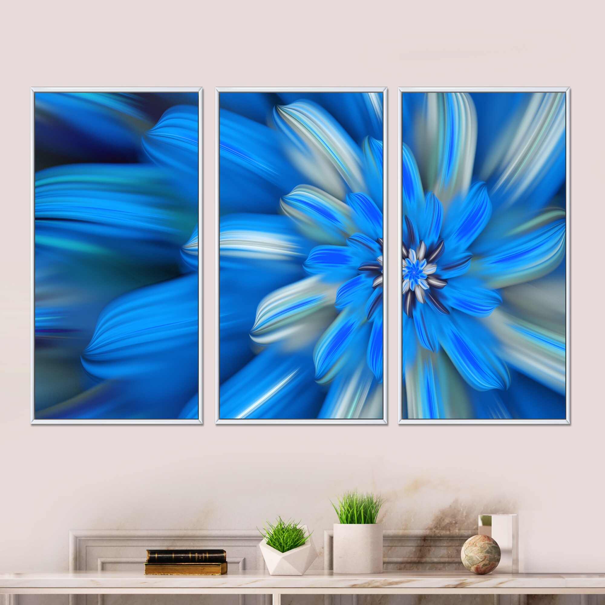 Designart "Exotic Dance of Blue Flower Petals" Floral Framed Canvas Wall Art Print Set of 3 - 4 Colors of Frames