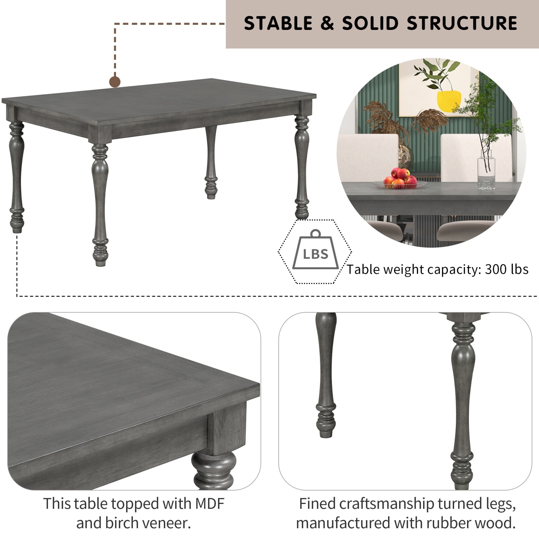 6-Piece Wood Dining Table Set Rectangular Table with Turned Legs
