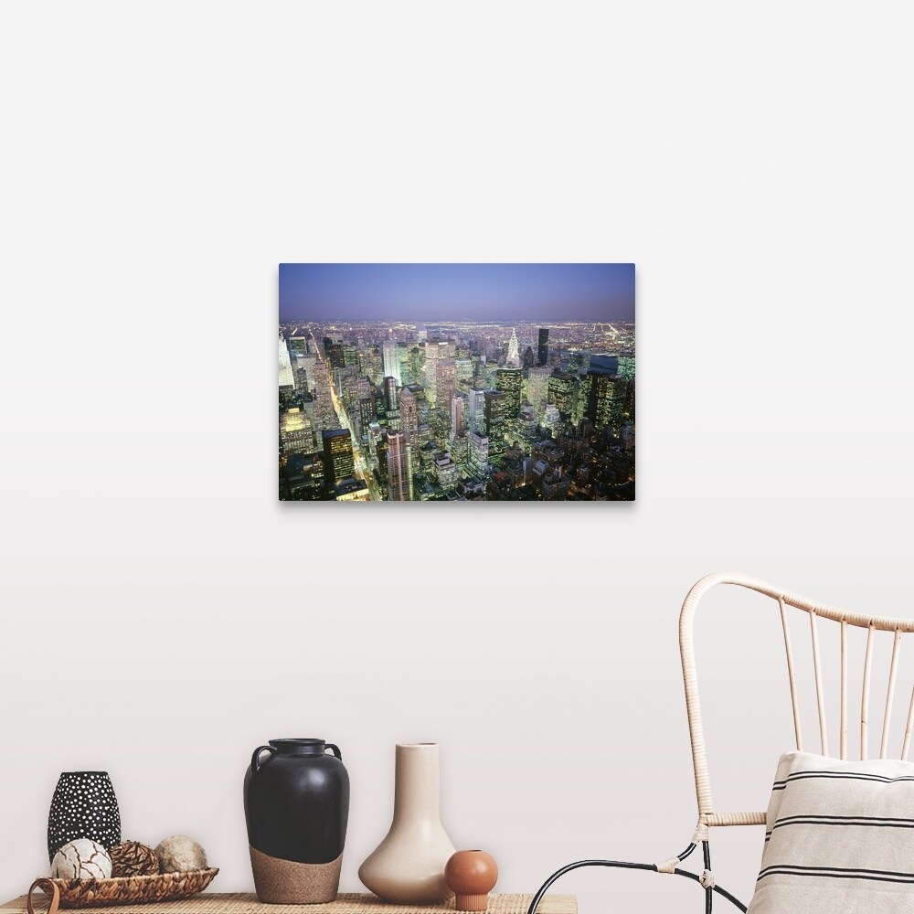 Easy Art Prints Panoramic Images's 'Buildings lit up in a city, New York City, New York, USA' Premium Canvas Art
