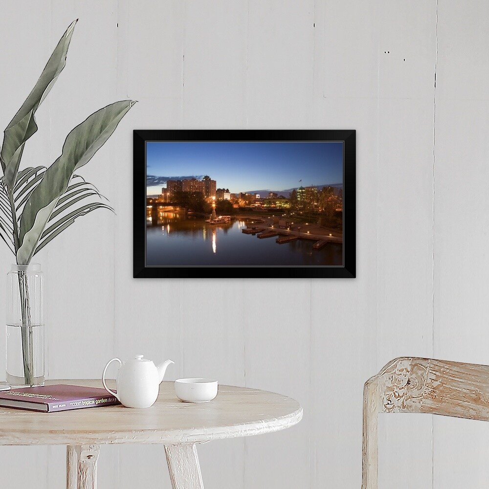 "High angle view of buildings lit up at dusk, Winnipeg, Manitoba, Canada" Black Framed Print