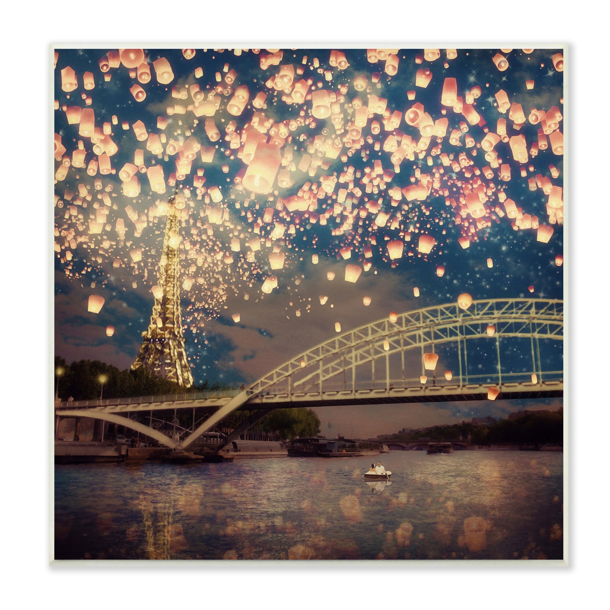 Stupell Luminous Lanterns Parisian City Skyline Modern Bridge Wood Wall Art - Blue