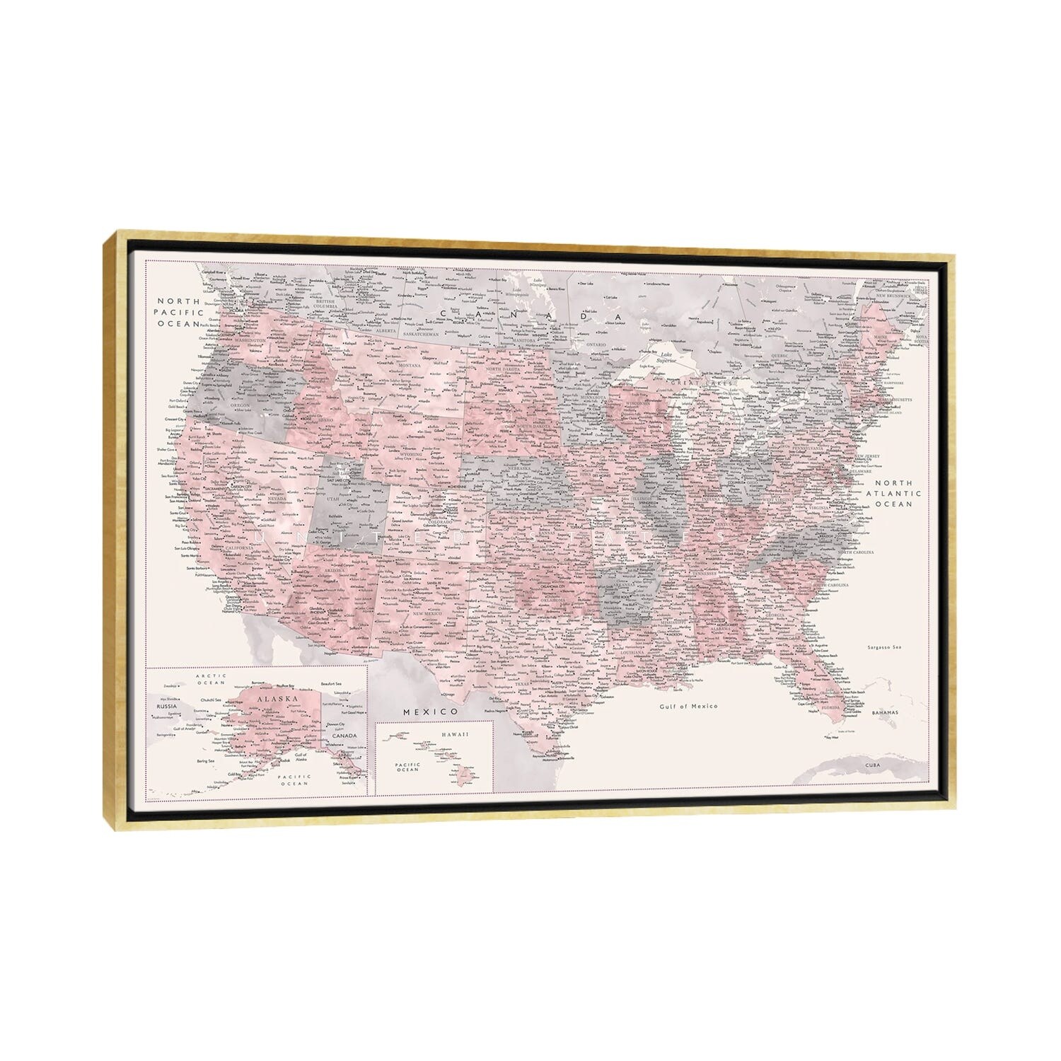 iCanvas "Highly Detailed Map of the Usa, Madelia, Cream, Dusty Pink And Grey" by blursbyai Framed Canvas Print