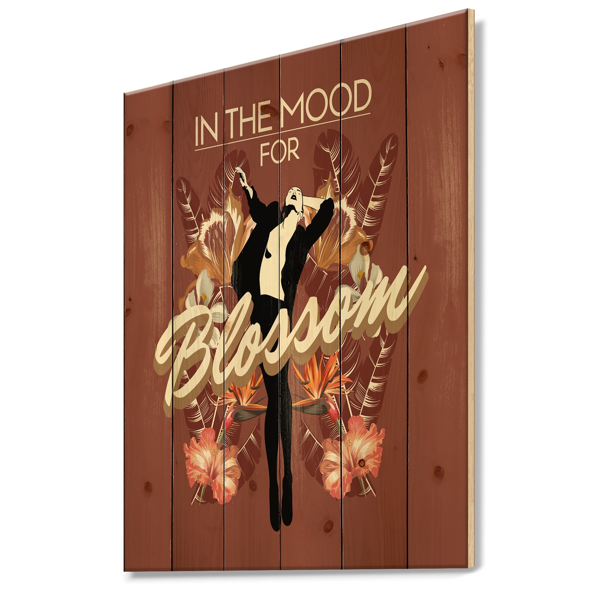 Designart 'In The Mood for Blossom of Pretty Woman With Tropical Flowers' Modern Print on Natural Pine Wood