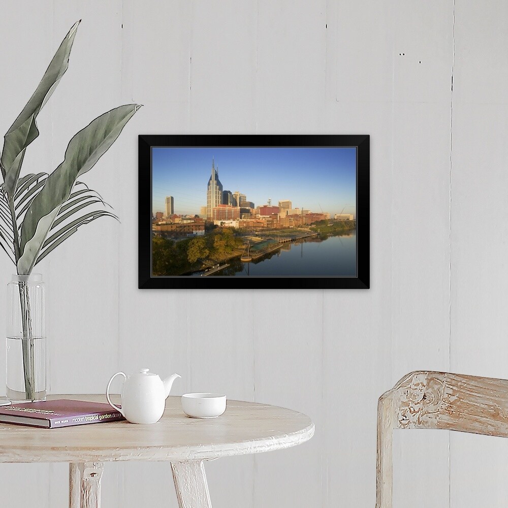 "High angle view of buildings in a city, Cumberland River, Nashville, Tennessee" Black Float Frame Canvas Art