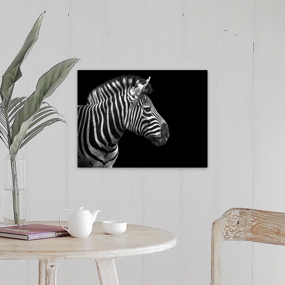 "Portrait of zebra in black and white on black background. Taken at Nashville " Canvas Wall Art