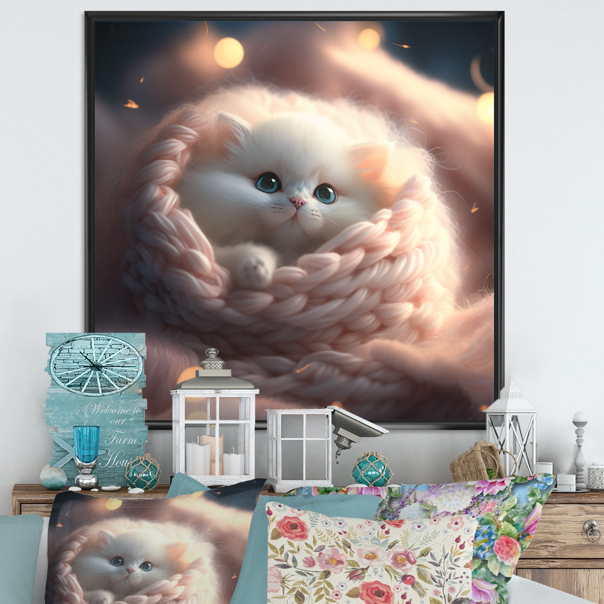 Designart "Cute Little White Kitten in Knitted Nest" Animals Cat Framed Canvas Wall Art Print