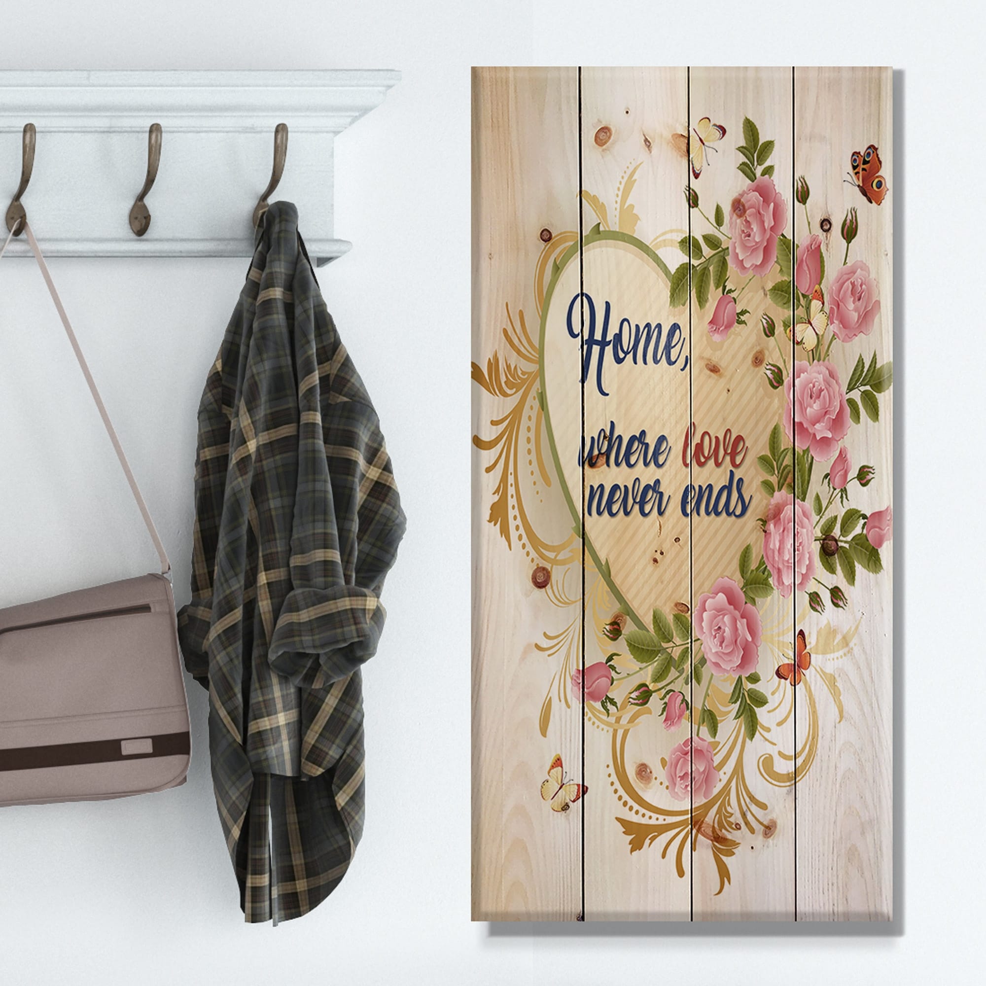 Designart 'Home where Love never ends. Flower Heart' Textual Entrance Art on Wood Wall Art - Green