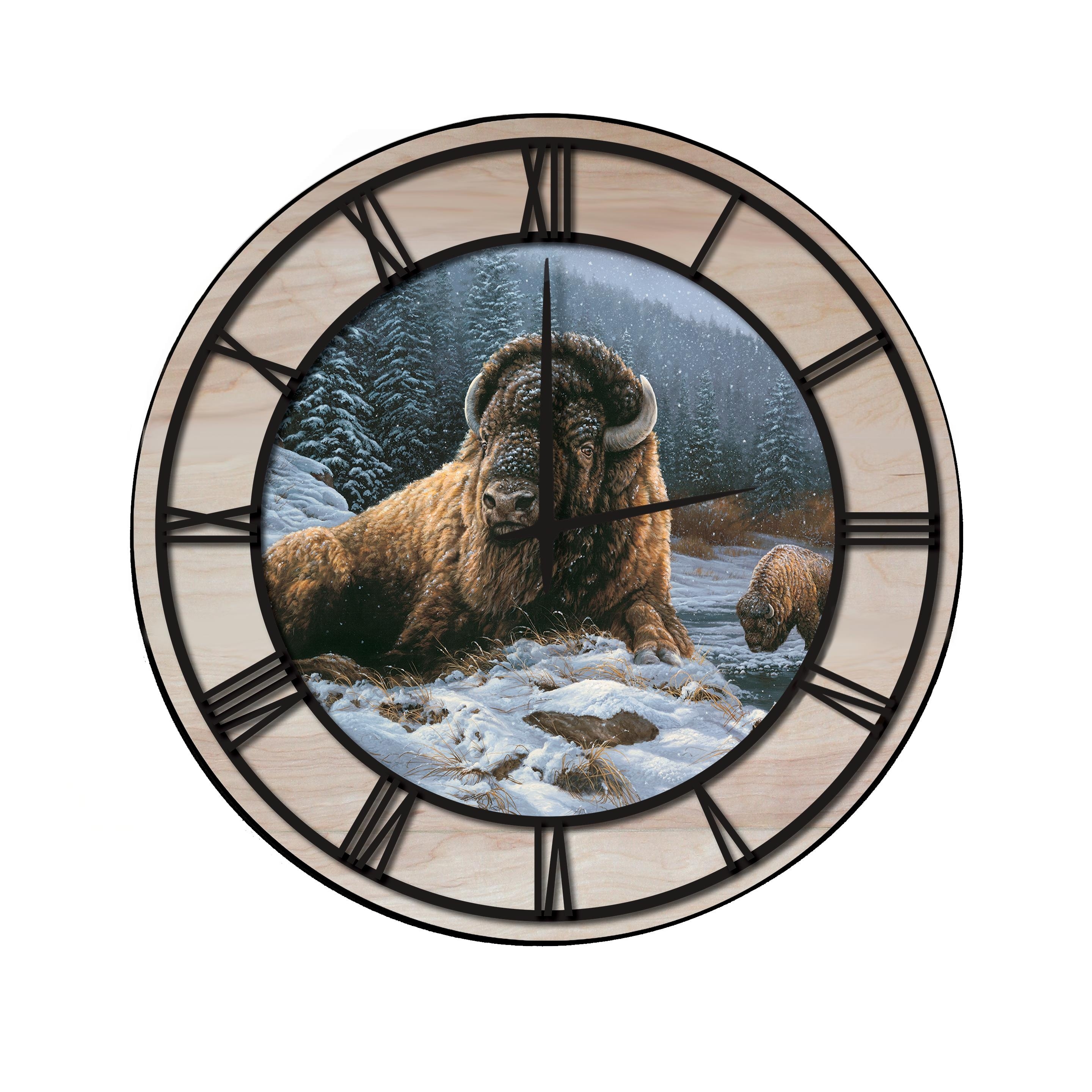 Wall Clock with Natural Woodgrain Accent - Spirit of the Wild (Bison) - Black Numbers - 24" x 24"