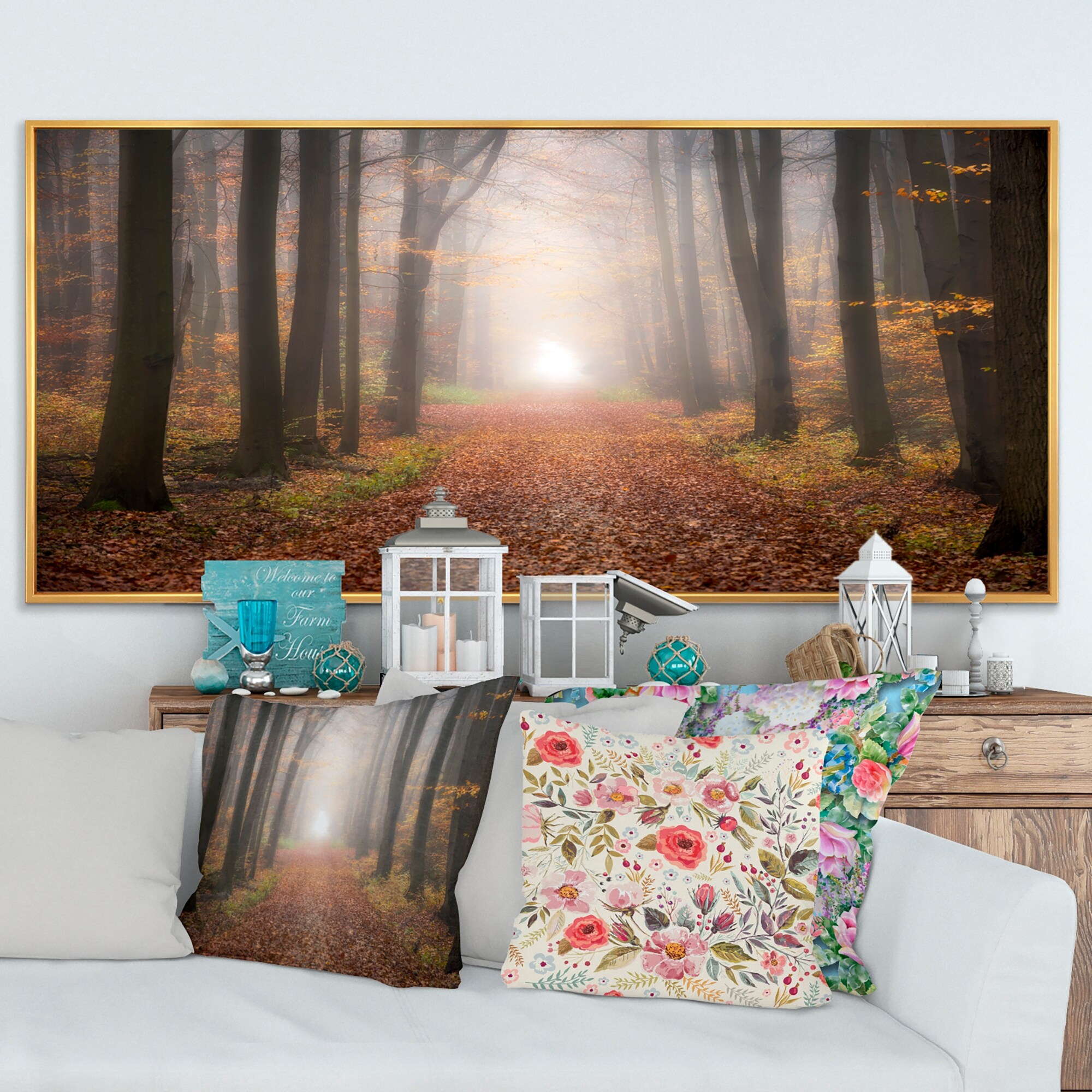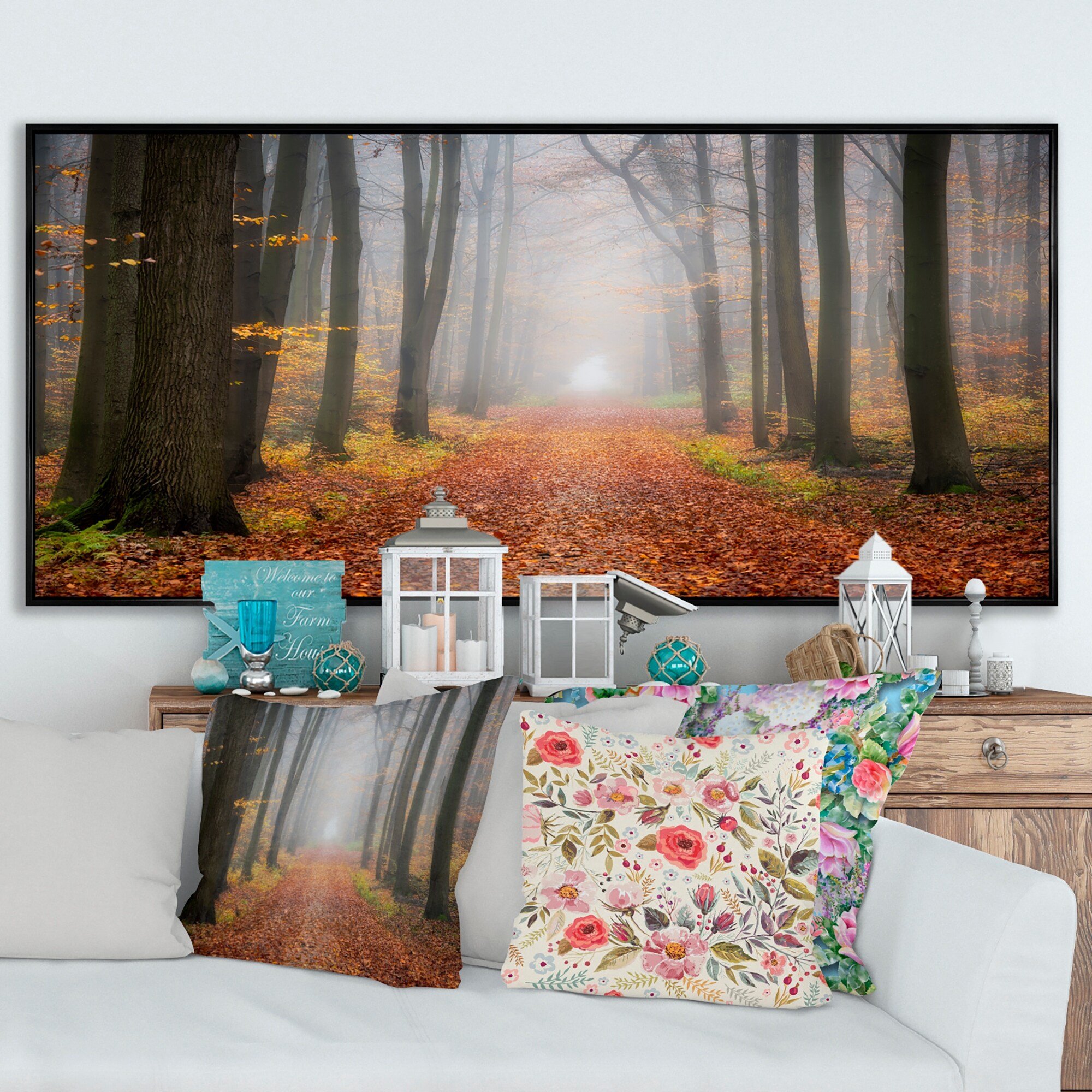 Designart "Forest Road Autumn Trees Foggy" Landscapes Framed Canvas Art Print
