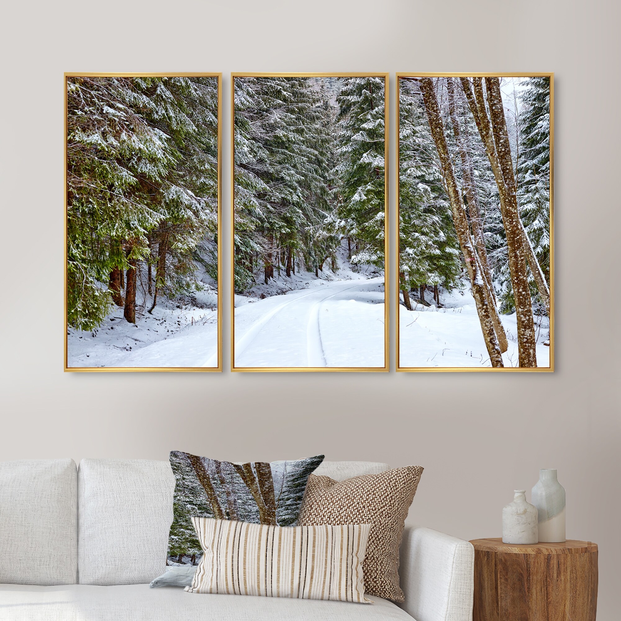 Designart "Snowy Road in the Forest" Landscape Framed Canvas Wall Art Print Set of 3 - 4 Colors of Frames