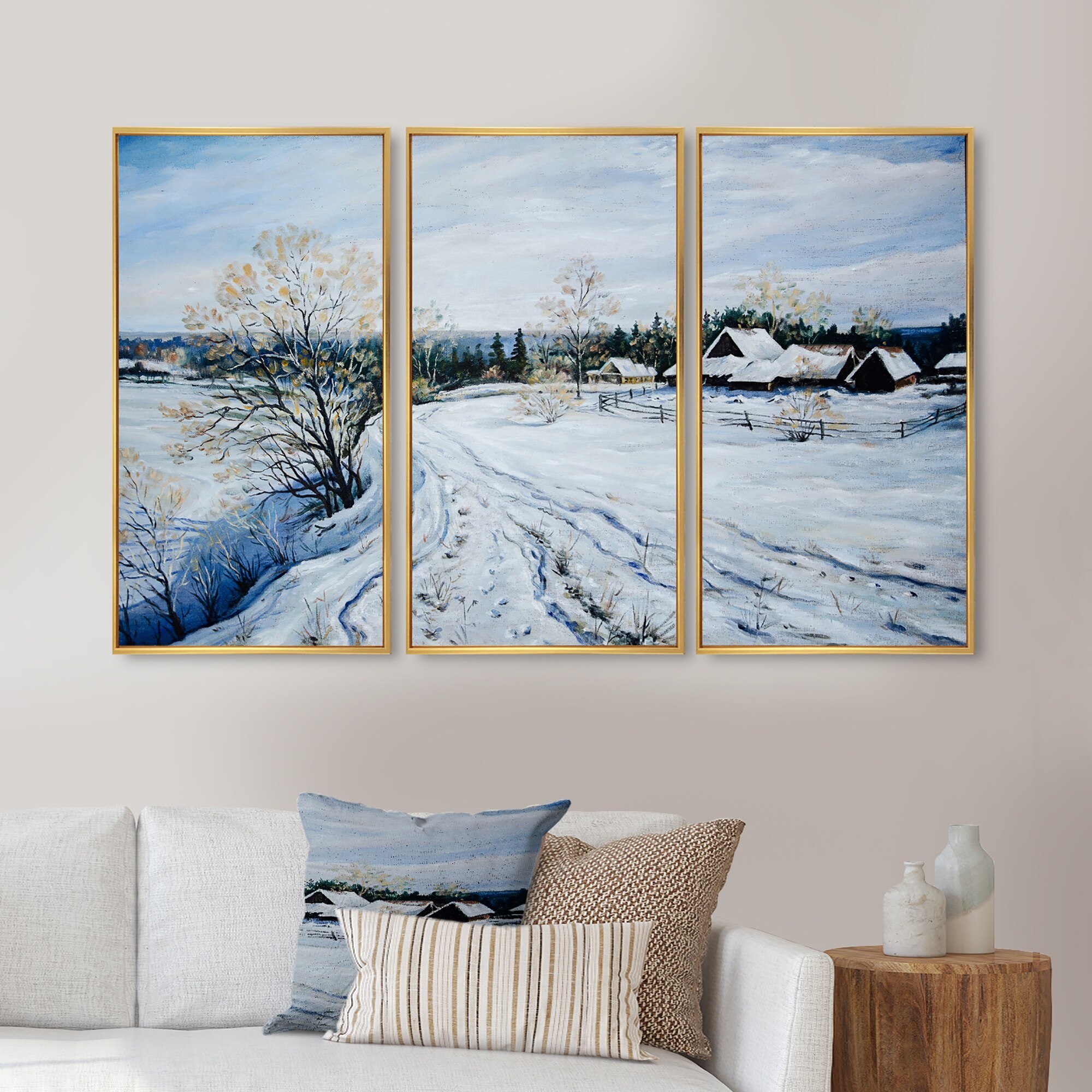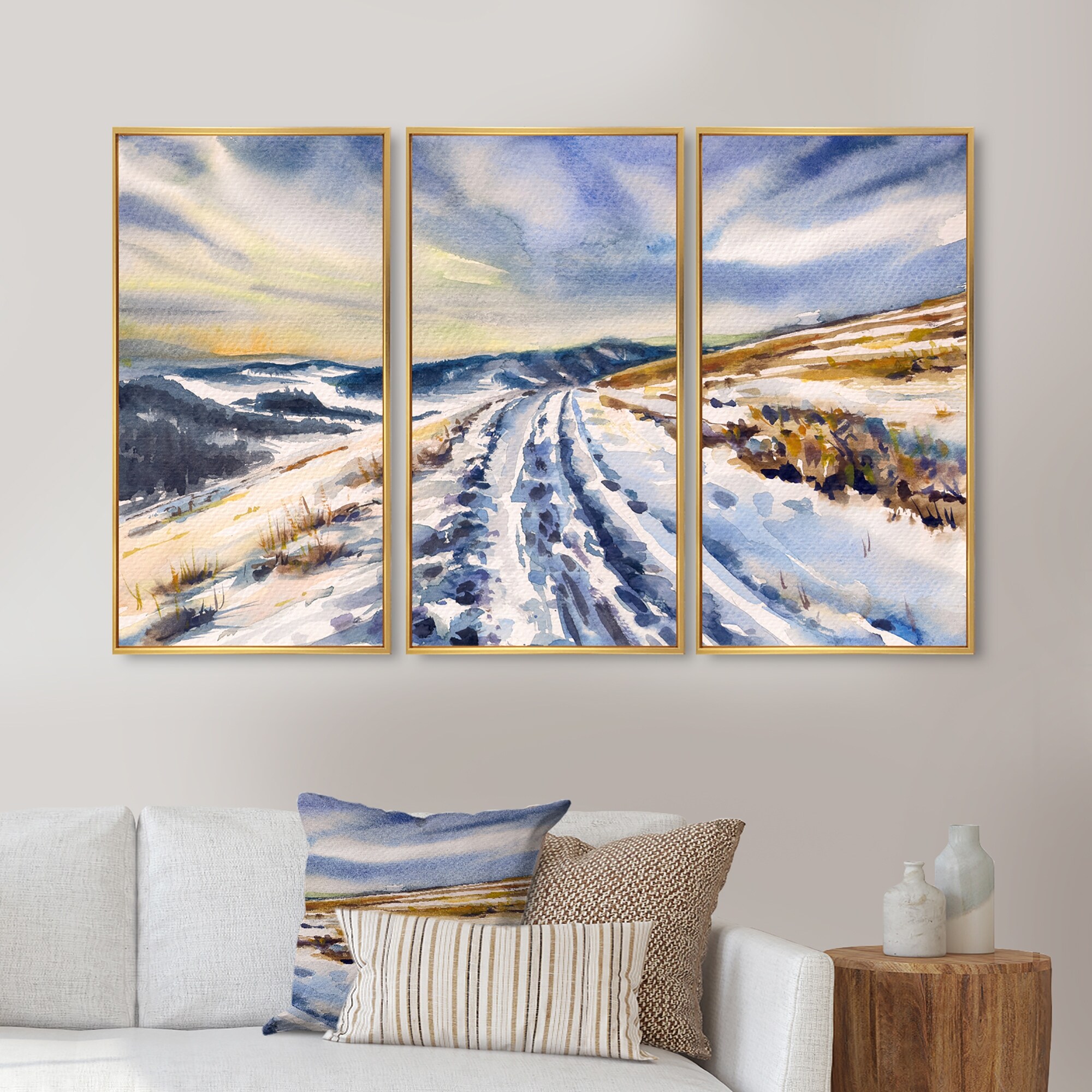 Designart "Country Road in Winter Times II" Traditional Framed Canvas Wall Art Set of 3 - 4 Colors of Frames