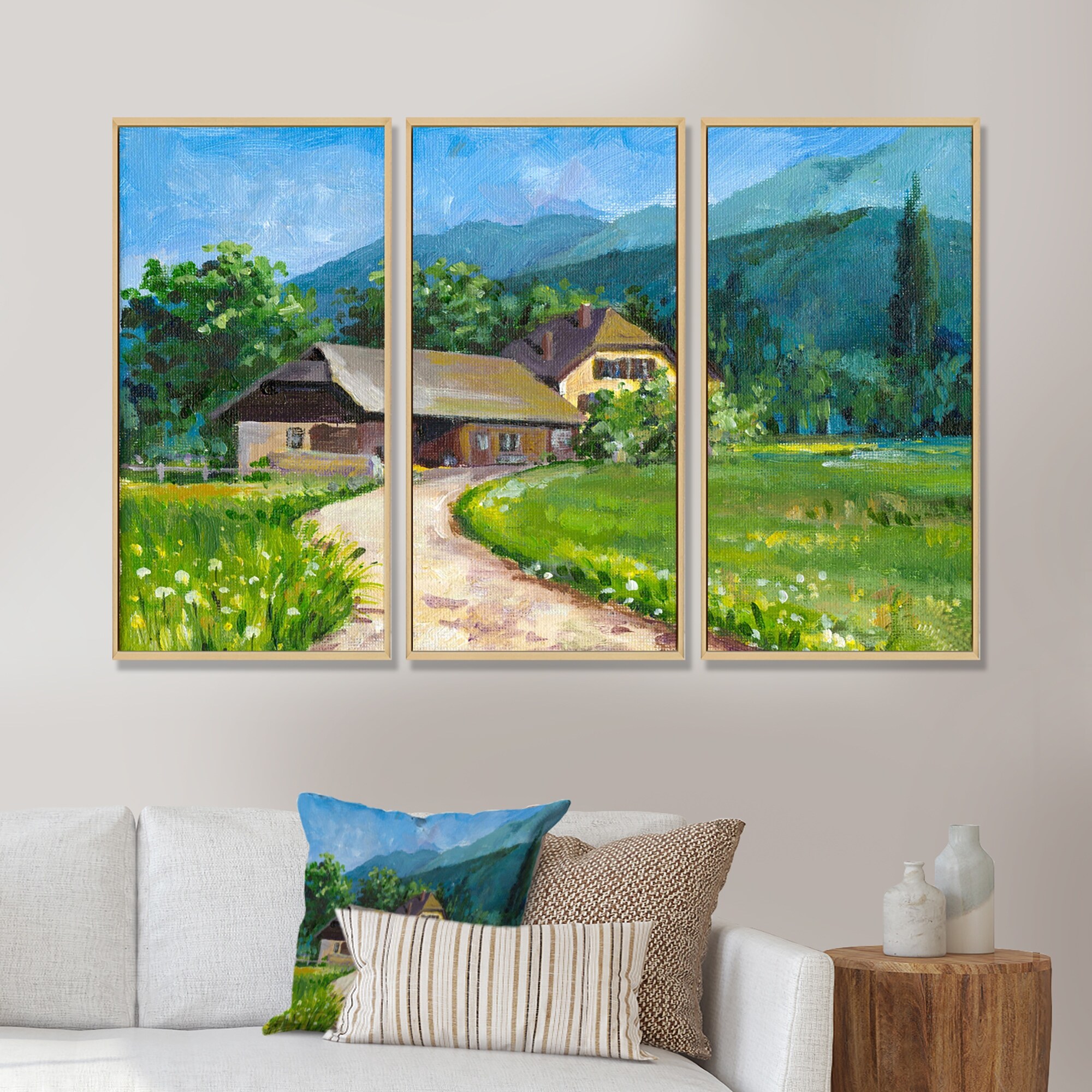 Designart "Little Road in the Landscape" Country Framed Canvas Wall Art Set of 3 - 4 Colors of Frames