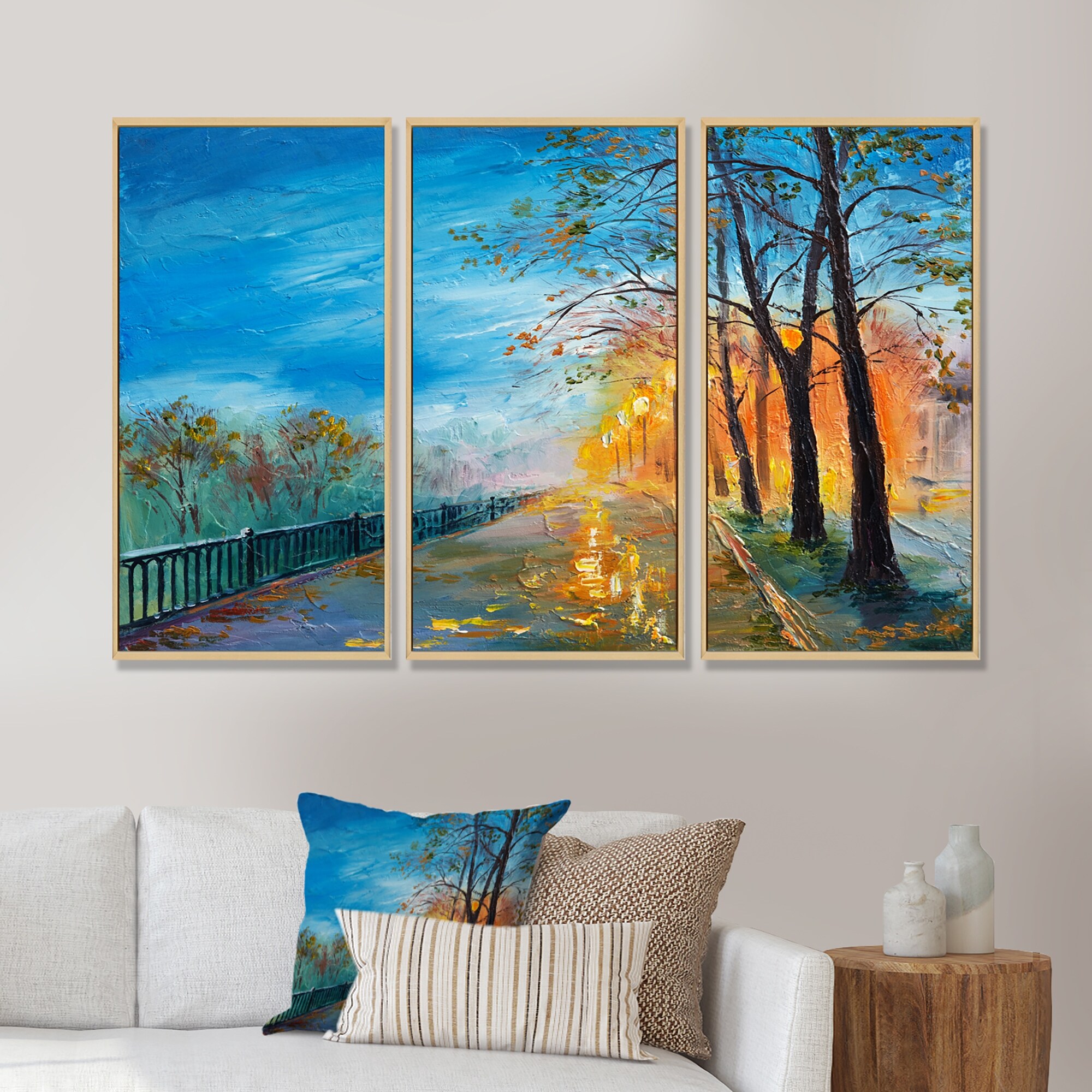 Designart "Evening On Autumn Road" Traditional Framed Canvas Wall Art Set of 3 - 4 Colors of Frames