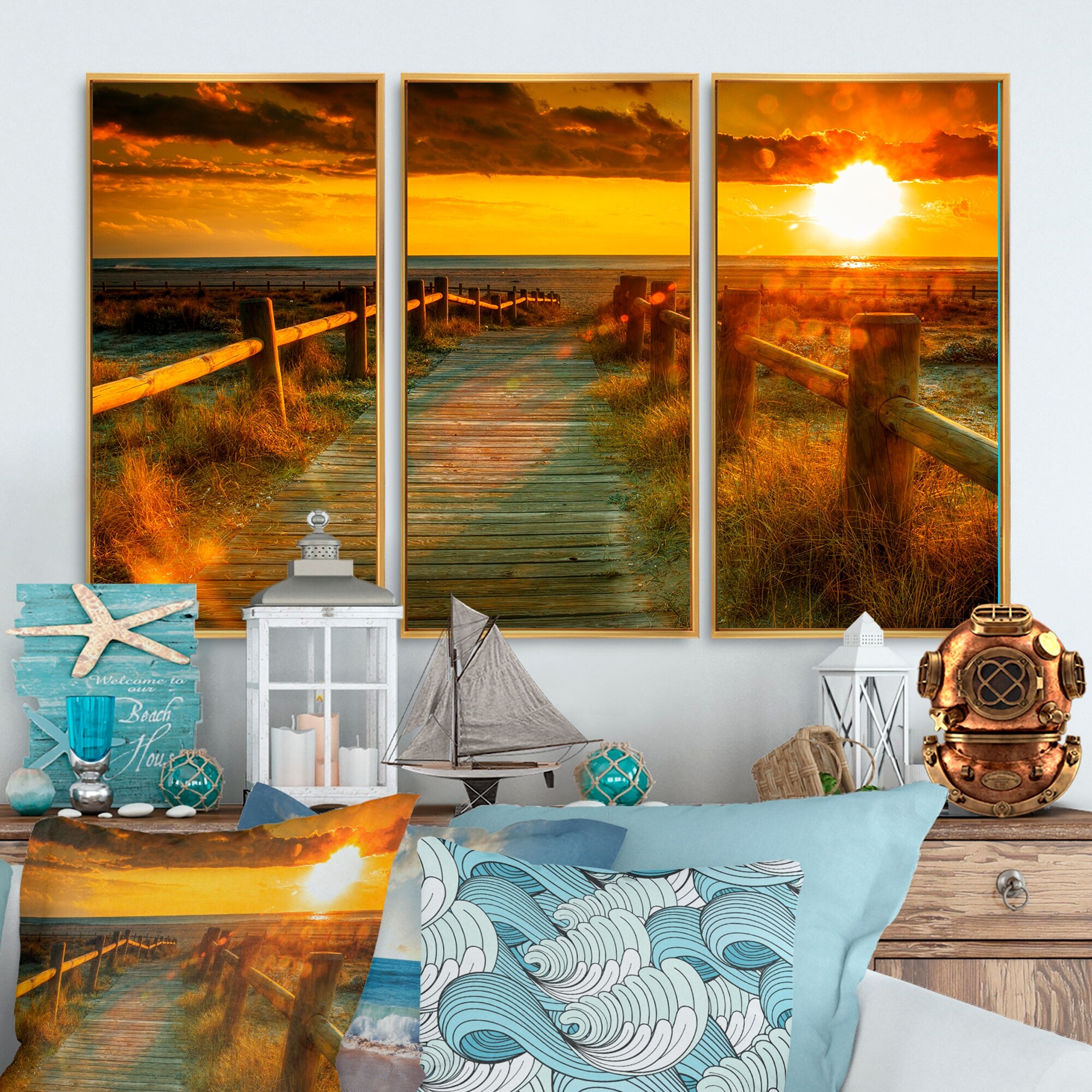 Designart "Little Road to the Beach During Sunset" Nautical & Coastal Framed Canvas Wall Art Set of 3 - 4 Colors of Frames